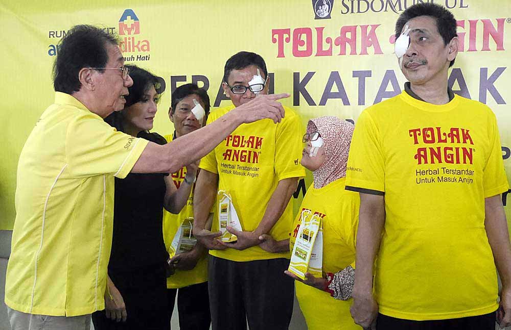 Direktur Sido Muncul Irwan Hidayat bersama artis senior Christine Panjaitan berdialog dengan penderita katarak yang sudah menjalani operasi di Rumah Sakit Antam Medika, Jakarta Timur, Senin (8/4/2019). PT Industri Jamu dan Farmasi Sido Muncul, Tbk melalui produk unggulannya Tolak Angin bersama artis senior Christine Panjaitan berkerja sama dengan Persatuan Dokter Spesialis Mata Indonesia (Perdami) Cab. DKI Jakarta dan Rumah Sakit Antam Medika menyelenggarakan Operasi Katarak Gratis kepada 30 penderita katarak masyarakat kurang mampu, sedangkan target 70 mata lainnya akan menjalani operasi pada penyelenggaraan selanjutnya.