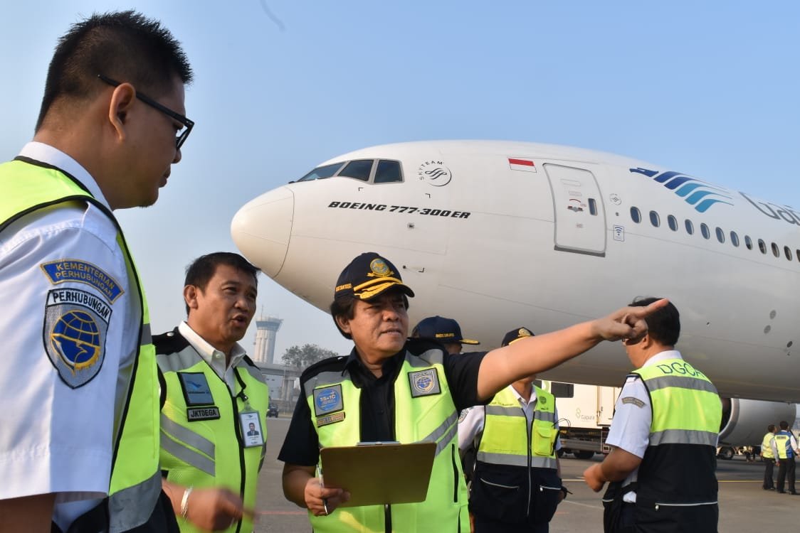 JAKARTA (Bisnis Jakarta) – Dirjen Perhubungan Udara Kementerian Perhubungan Agus Santoso didampingi Direktur Teknik Garuda dan kepala Kantor Otoritas Bandar Udara Wilayah 1, hari ini melaksanakan rampcheck pesawat Boeing B777 Garuda registrasi PK-GIC di Terminal 2 Bandara Soekarno Hatta.