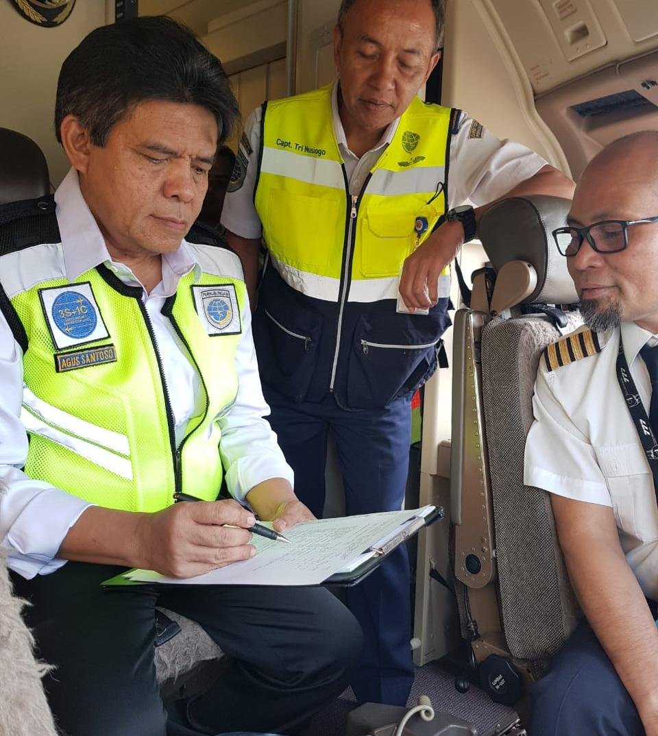 Dalam kesempatan ini, Agus Santoso menyempatkan diri masuk ke kokpit dan berbincang dengan pilot Capt. Anggie Setiawan yang akan menerbangkan pesawat tersebut. Agus menyatakan pesawat yang akan bertolak ke tanah suci membawa jamaah haji menuju Madinah ini layak terbang.