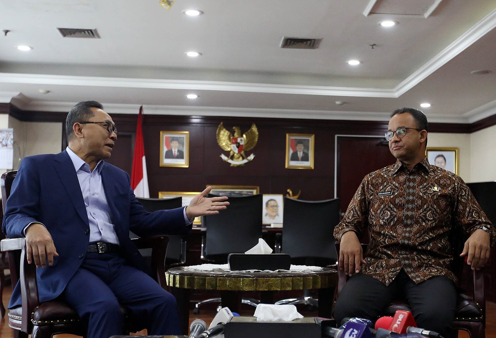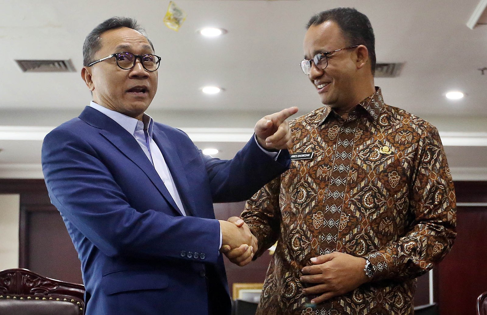 Ketua MPR Zulkifli Hasan bertemu dengan Gubernur DKI Jakarta Anies Baswedan untuk menggelar pertemuan di ruang pimpinan MPR RI Kompleks Parlemen, Senayan, Jakarta Pusat, Kamis (5/7/18). Pertemuan tersebut membahas salah satunya terkait dengan penyegelan proyek reklamasi dan juga membicarakan masalah politik.(Bisnis Jakarta/ADE)