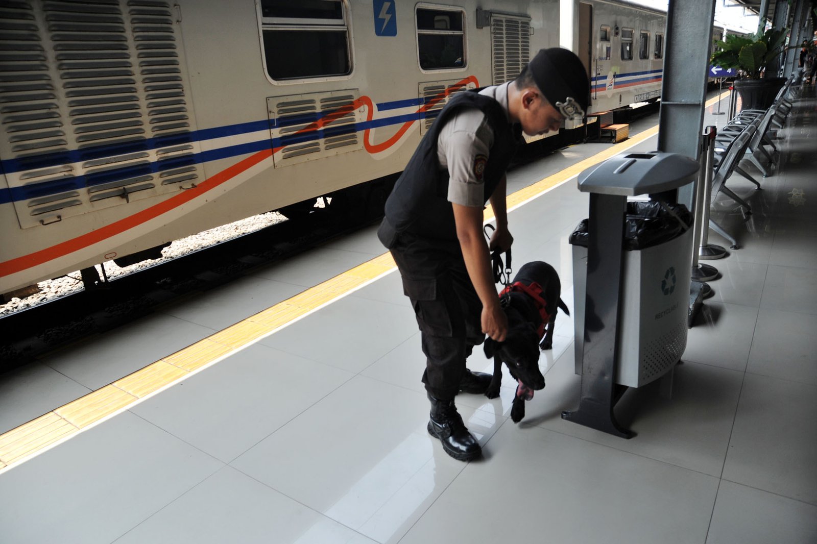 Petugas dengan anjing pelacak menyisiri Stasiun Pasar Senen, Jakarta Pusat, Sabtu (9/6/18). Anjing- anjing pelacak dari unit K9 (unit keamanan dengan hewan berupa anjing) Polda Metro Jaya disiagakan di Stasiun Senen sebagai upaya meningkatkan keamanan di lingkungan stasiun demi mencegah hal-hal yang tidak diinginkan.(Bisnis Jakarta/ADE)