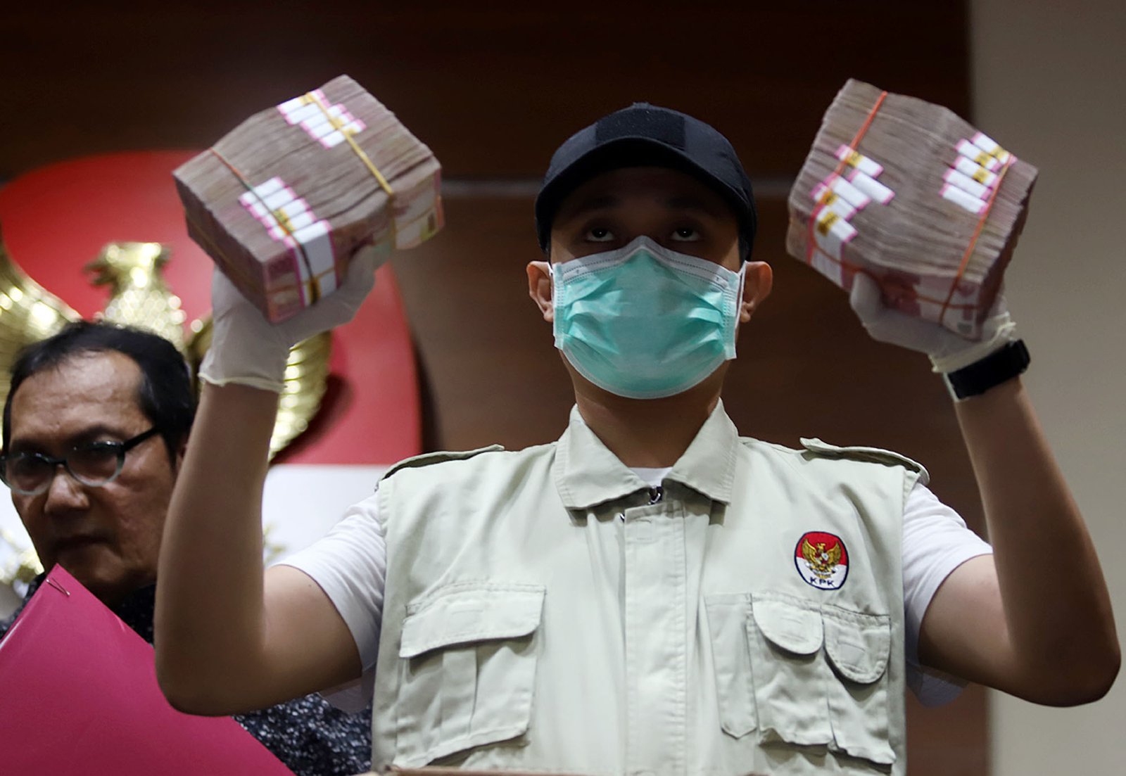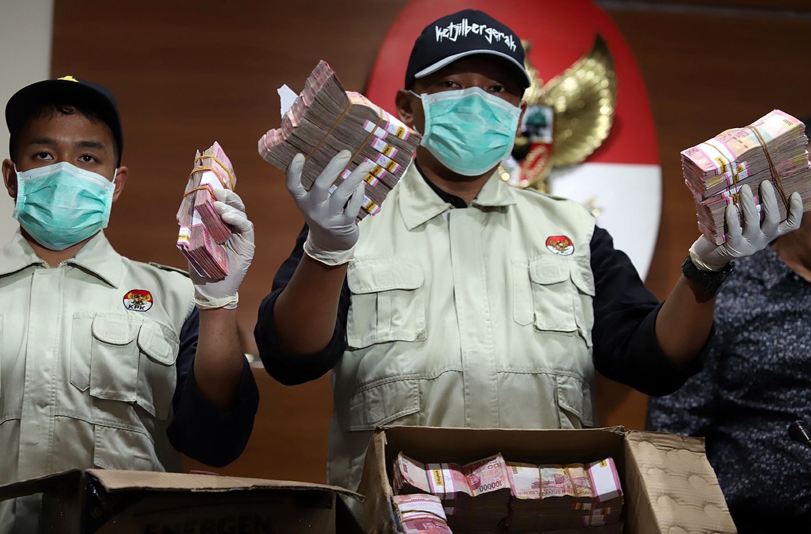 Penyidik Komisi Pemberantasan Korupsi (KPK) saat menunjukkan barang bukti Operasi Tangkap Tangan (OTT) KPK di Blitar dan Tulungagung di gedung KPK, Kuningan, Jakarta Selatan, Jumat (8/6/18). KPK menetapkan tiga orang tersangka untuk perkara di Blitar terkait ijon proyek pembangunan sekolah lanjutan pertama dan empat orang tersangka untuk perkara di Tulungagung terkait suap proyek pembangunan infrastruktur jalan. KPK hingga kini masih mencari keberadaan Wali Kota Blitar Samanhudi Anwar dan Bupati Tulungagung nonaktif Syahri Mulyo yang terjerat dalam OTT ini.(Bisnis Jakarta/ADE)