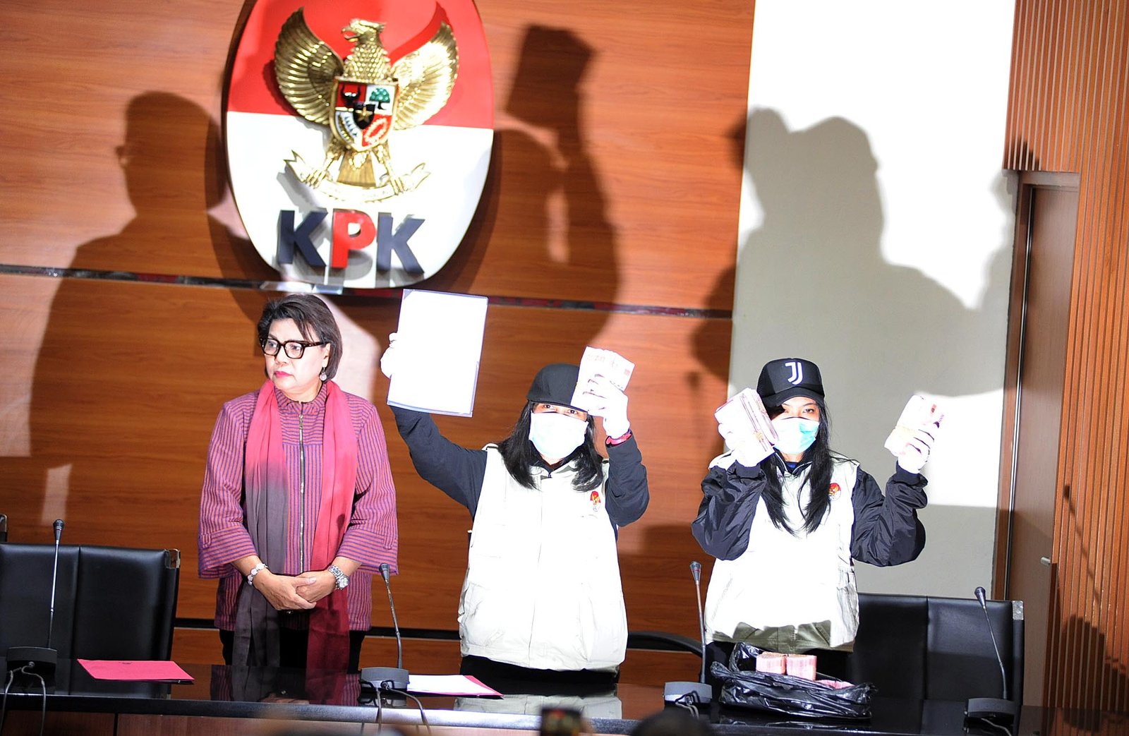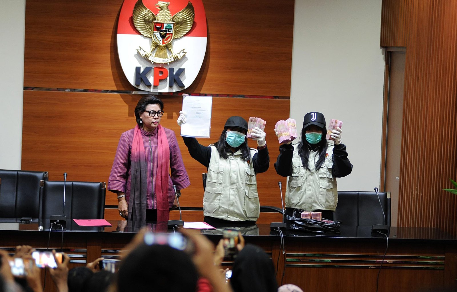 Wakil Ketua Komisi Pemberantasan Korupsi (KPK) Basaria Panjaitan (kiri) menyaksikan penyidik KPK menunjukan barang bukti (barbuk) saat memberikan keterangan pers mengenai operasi tangkap tangan (OTT) Wakil Ketua Komisi VII DPR dari Fraksi Partai Golkar Eni M Saragih di gedung Komisi Pemberantasan Korupsi (KPK), Kuningan, Jakarta Selatan, Sabtu (14/7/18). Dalam OTT tersebut KPK berhasil mengamankan 13 orang uang dan uang sebesar Rp500 juta. KPK menetapkan dua orang tersangka yaitu anggota Komisi VII DPR RI Eni Maulani Saragih sebagai penerima hadiah dan Johannes Budisutrisno Kotjo sebagai pemegang saham Blackgold Natural Resources Limited yang diduga sebagai pemberi hadiah dalam kasus dugaan korupsi terkait kesepakatan kontrak kerja sama pembangunan PLTU Riau-1.(Bisnis Jakarta/ADE)