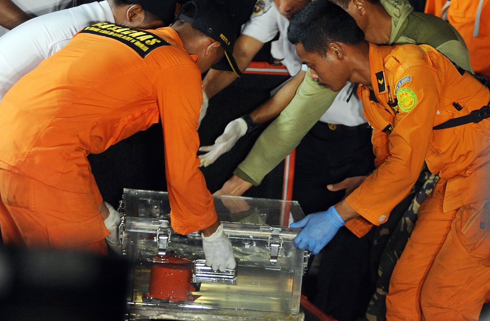 Tim SAR Gabungan mengangkat Kotak hitam atau black box pesawat Lion Air PK-LQP JT 610 yang jatuh di perairan Karawang, Jawa Barat, yang berhasil ditemukan, di posko utama evakuasi Lion Air JT610 di Dermaga JICT II, Tanjung Priok, Jakarta Utara, Kamis (1/11/18). Penemuan black box atau alat perekam data penerbangan pesawat Lion Air bernomor registrasi PK-LQP dengan nomor penerbangan JT 610 tersebut diserahkan ke pihak KNKT untuk dilakukan investigasi lebih lanjut.(Bisnis Jakarta/ADE)