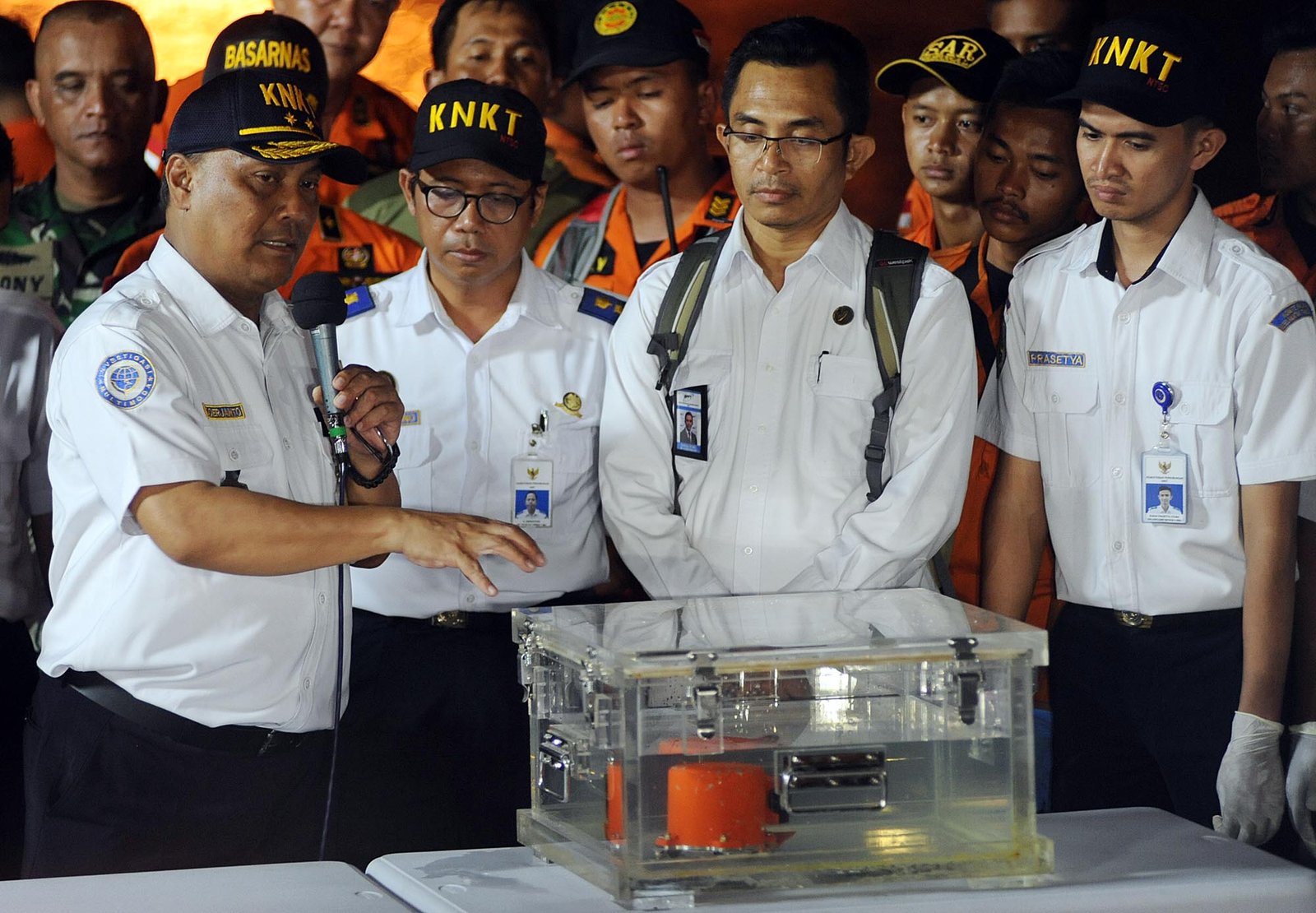 Kepala Komisi Nasional Keselamatan Transportasi (KNKT) Soerjanto Tjahjono (kiri) memberikan keterangan kepada wartawan terkait penemuan Kotak hitam atau black box pesawat Lion Air PK-LQP JT 610 yang jatuh di perairan Karawang, Jawa Barat, di posko utama evakuasi Lion Air JT610 di Dermaga JICT II, Tanjung Priok, Jakarta Utara, Kamis (1/11/18). Penemuan black box atau alat perekam data penerbangan pesawat Lion Air bernomor registrasi PK-LQP dengan nomor penerbangan JT 610 tersebut diserahkan ke pihak KNKT untuk dilakukan investigasi lebih lanjut.(Bisnis Jakarta/ADE)