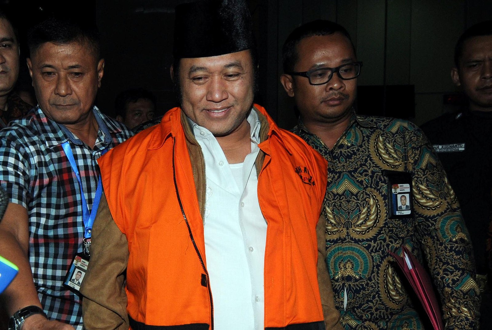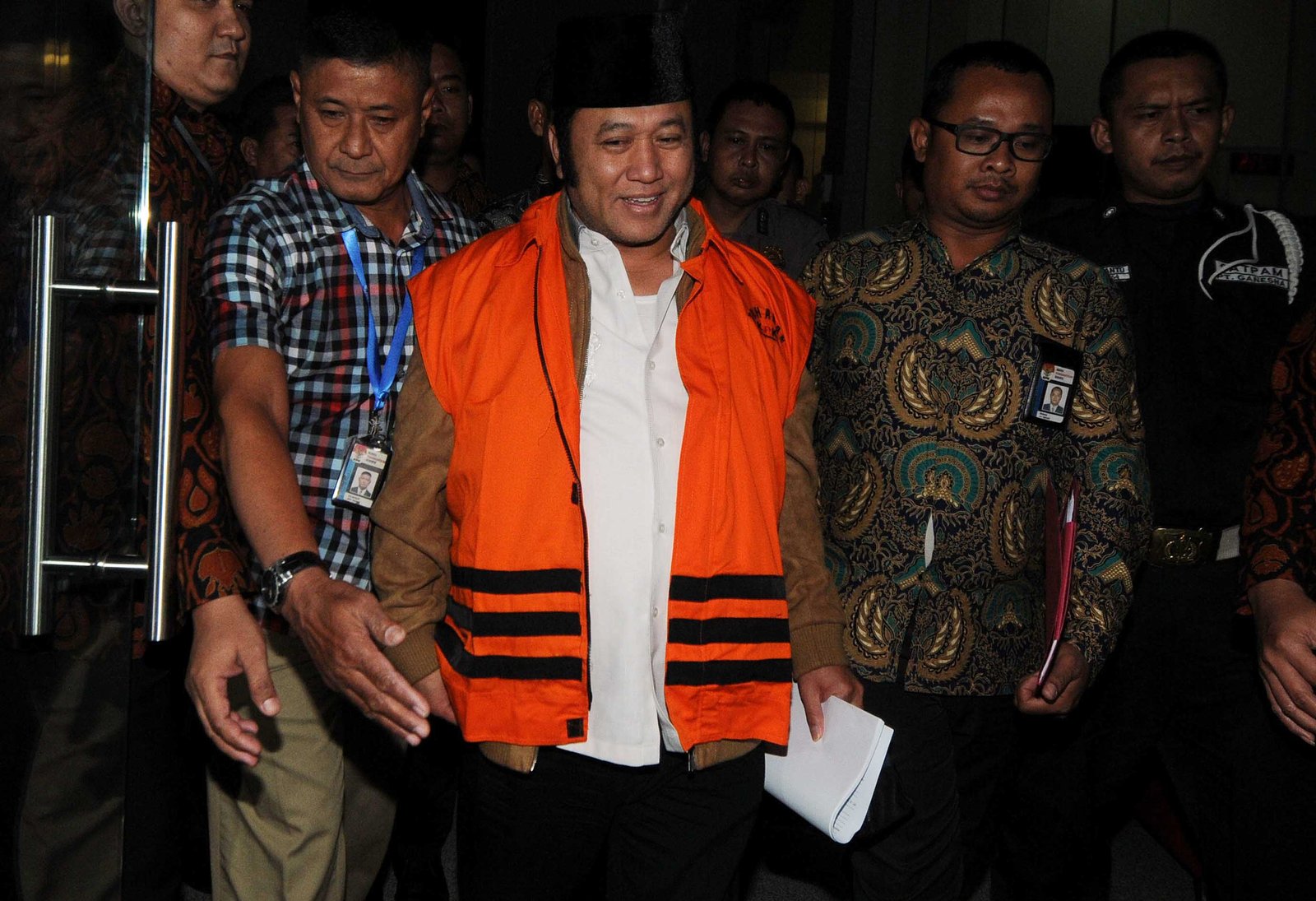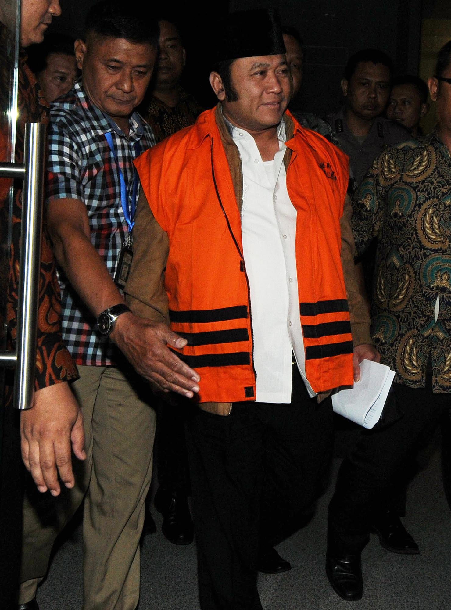 Bupati Lampung Selatan Zainudin Hasan yang terjaring Oprasi Tangkap Tangan (OTT) Komisi Pemberantasan Korupsi (KPK) mengenakan rompi tahanan usai menjalani pemeriksaan penyidik KPK di Kuningan, Jakarta Selatan, Sabtu (28/7/18). Adik Ketua MPR Zulkifli Hasan tersebut ditetapkan sebagai tersangka kasus dugaan suap pengadaan barang dan jasa di Pemkab Lampung Selatan tahun anggaran 2018.(Bisnis Jakarta/ADE)