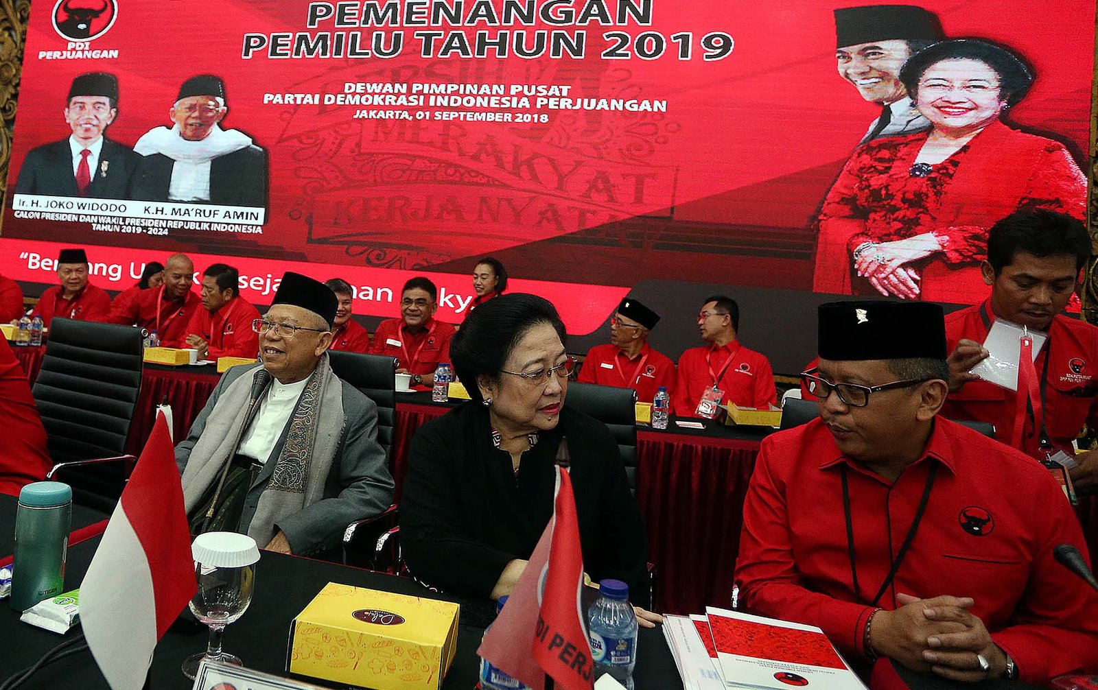 Ketua Umum PDIP Megawati Soekarnoputri bersama Calon Wakil Presiden Ma’ruf Amin dan Sekjen PDIP Hasto Kristoyanto saat Rapat Koordinasi Nasional (Rakornas) Konsolidasi Persiapan Pemenangan Pemilihan Legislatif dan Pemilihan Presiden dan Wakil Presiden (Pilpres) 2019, di Kantor DPP PDIP, Jalan Diponegoro, Jakarta, Sabtu (1/9/18). Pada Rakornas tersebut, PDIP akan memberikan pembekalan untuk para calon legislatif dan untuk memenangkan pasangan Capres-Cawapres Joko Widodo dan Ma’ruf Amin (Bisnis Jakarta/ADE)