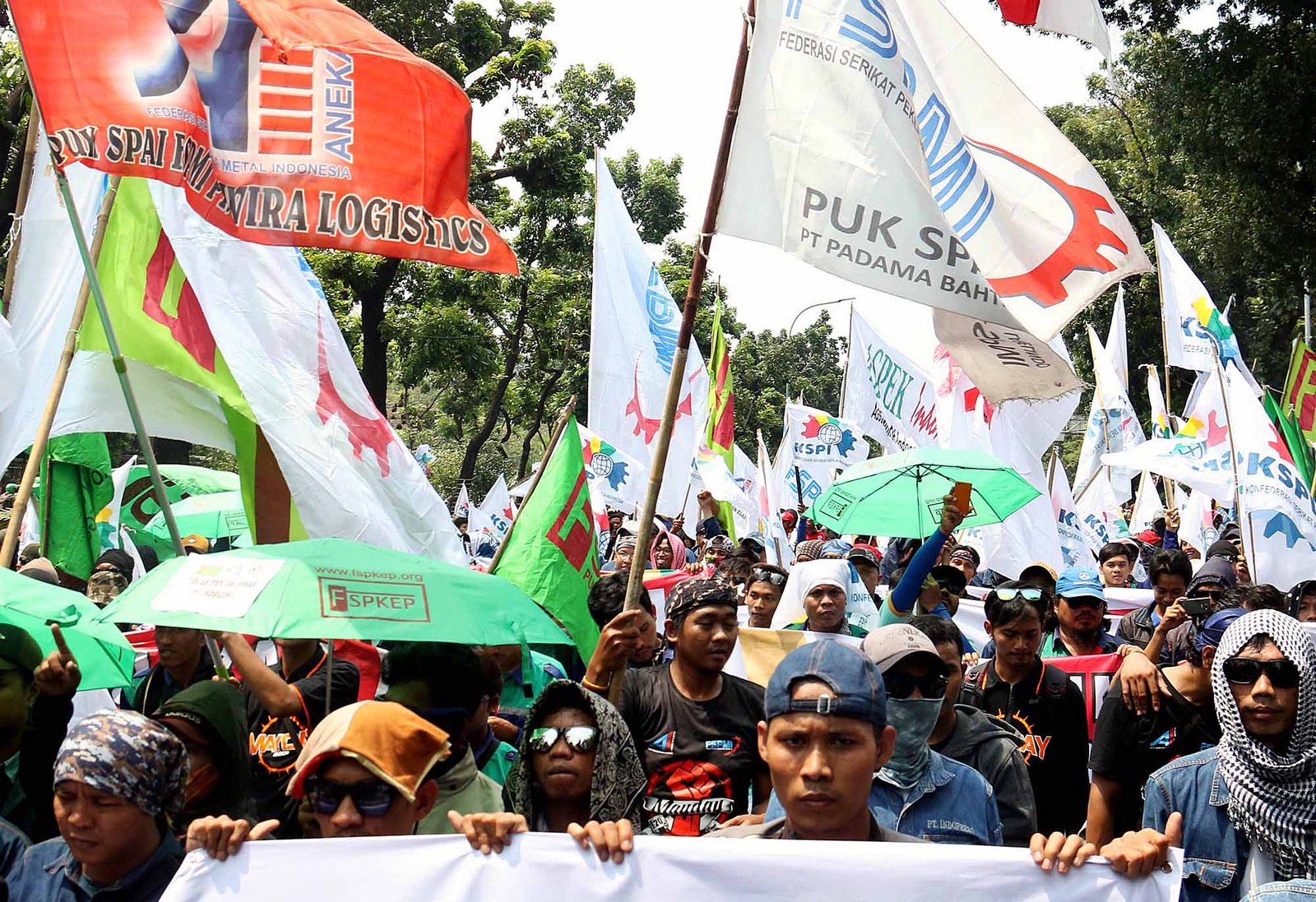Ribuan buruh dari berbagai elemen melakukan aksi long march menuju Istana Merdeka, Jakarta Pusat, Selasa (8/8). Para buruh dari berbagai yang mengatasnamakan “Aksi8Agusutus” menuntut ketidakadilan pemerintah dalam mengeluarkan kebijakan buruh di Indonesia, mereka menolak penetapan upah industri padat karya dibawah nilai upah minimum dan menolak Perppu Ormas yang menciderai demokrasi.(Bisnis Jakarta/ADE)