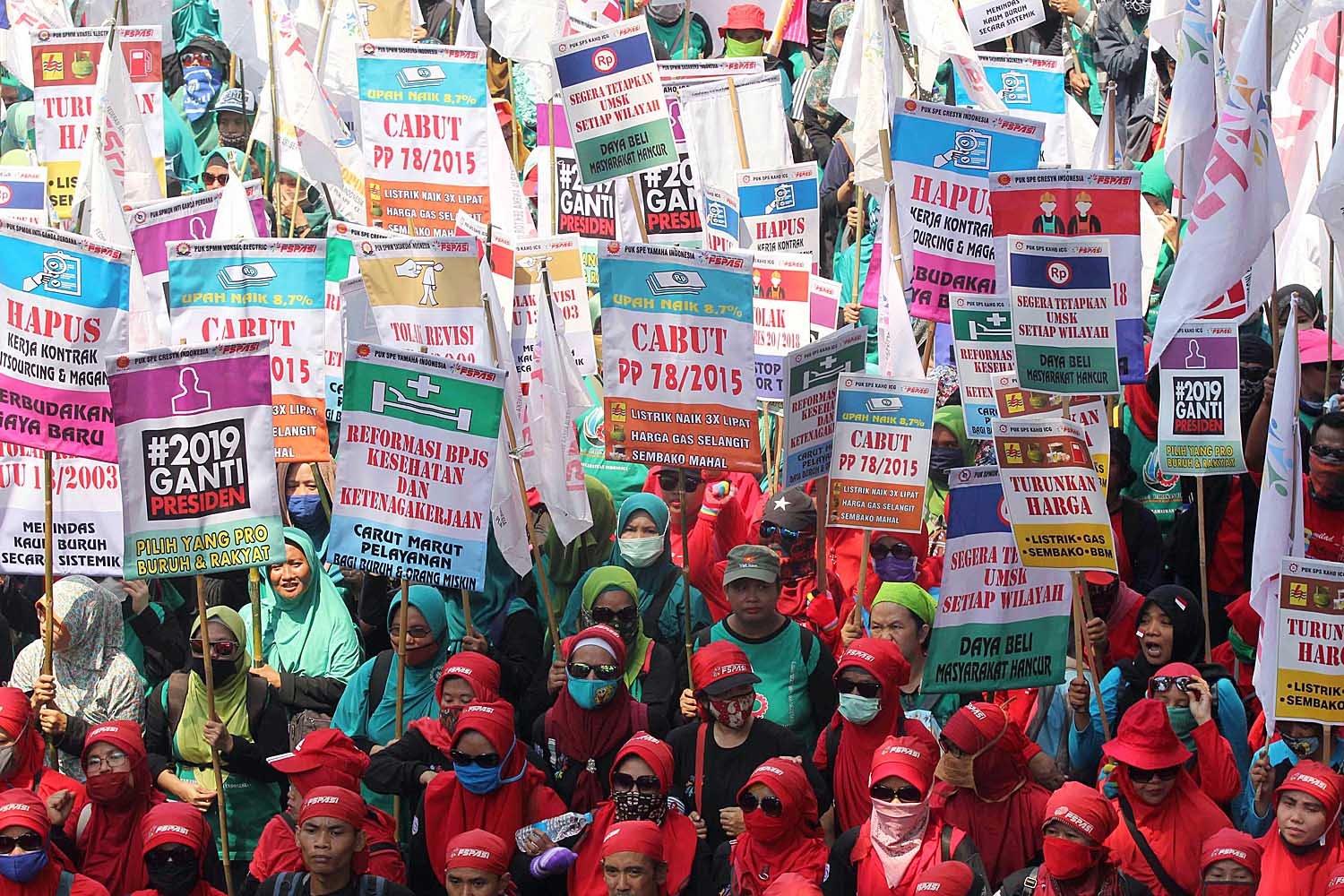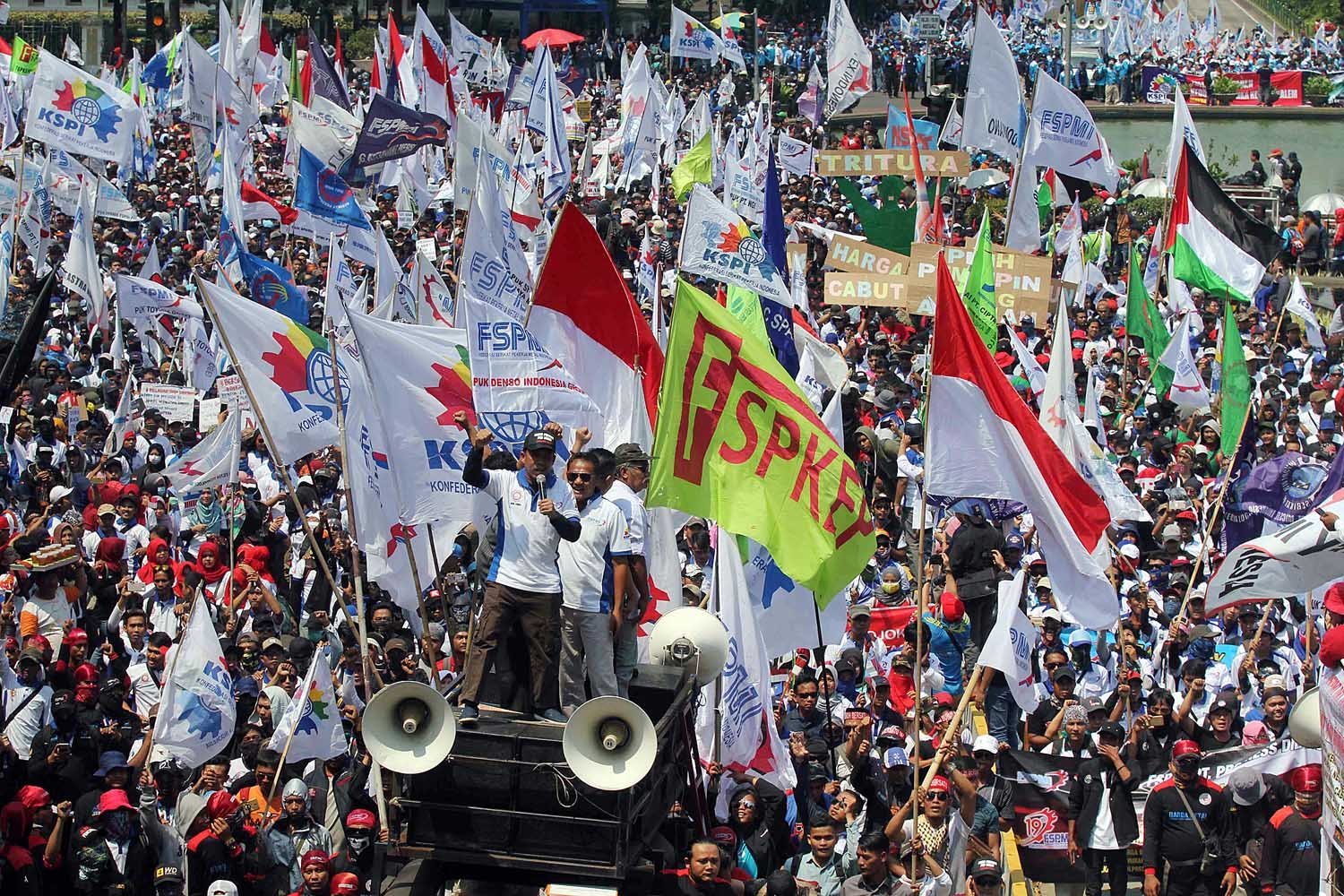 Ribuan buruh yang tergabung dalam berbagai organisasi melakukan longmarch memperingati Hari Buruh sedunia (May Day) di Jalan Medan Merdeka Barat, Jakarta Pusat, Selasa (1/5/18). Dalam aksinya mereka meminta pemerintah untuk meningkatkan kesejahteraan para kaum buruh.(Bisnis Jakarta/ADE)