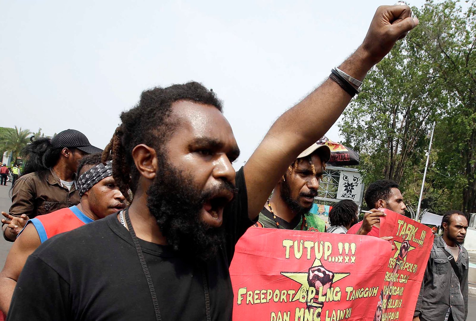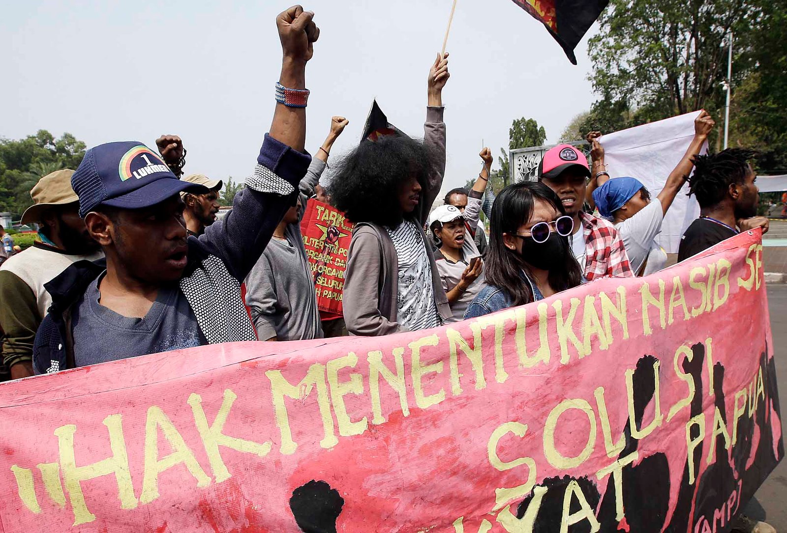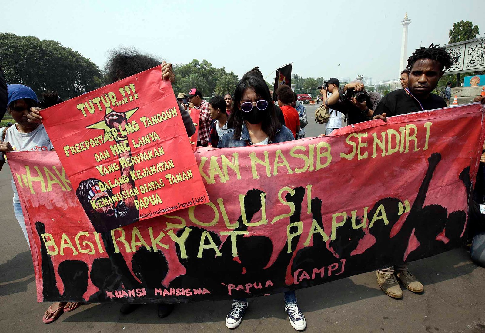 Sejumlah demonstran Aliasi Mahasiswa Papua berunjuk rasa di depan Istana Merdeka, Jakarta Pusat, Kamis (2/8/18). Dalam aksi damai memperingati referendum ke-49 Papua tersebut Aliasi Mahasiswa Papua menuntut pemerintah pusat segera mengakui resolusi bahwa Papua Barat berhak menentukan nasibnya sendiri untuk merdeka.(Bisnis Jakarta/ADE)