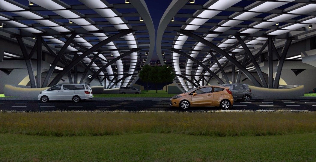 Tepat di bagian yang membentang di jalan raya, dibangun kanopi berkonsep“Cakrawala” sebagai pelindung jalur penghubung runway itu.