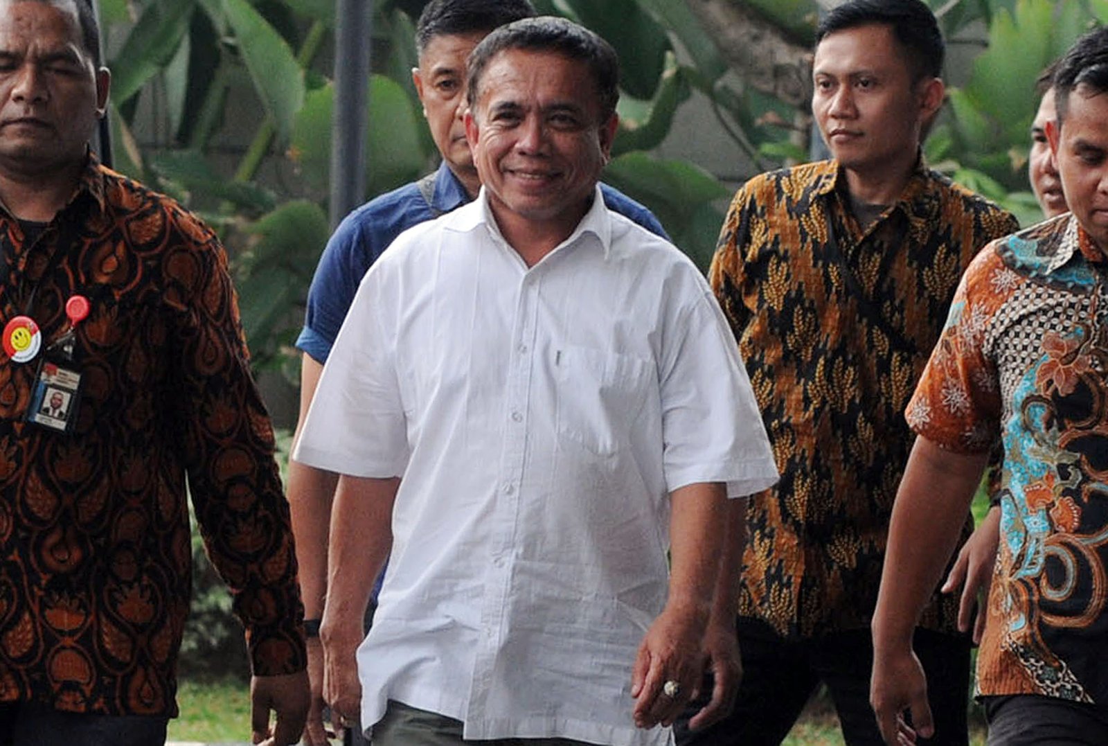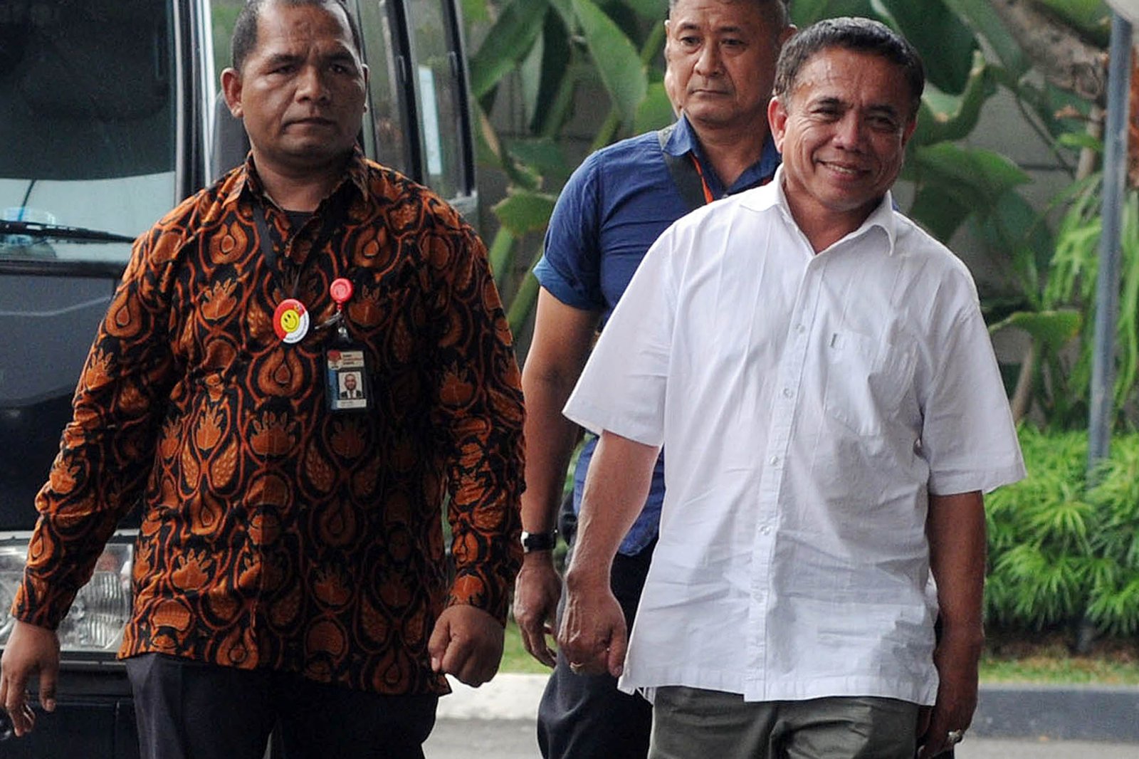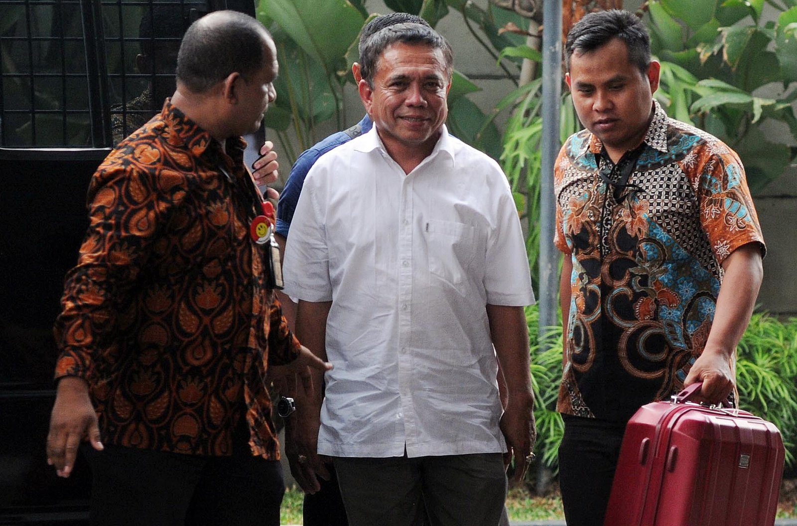 Gubernur Aceh Irwandi Yusuf (kemeja putih) dikawal sejumlah petugas saat akan menjalani pemeriksaan penyidik pascaterjaring Operasi Tangkap Tangan (OTT) KPK tiba di Gedung Komisi Pemberantasan Korupsi (KPK), Kuningan, Jakarta Selatan, Rabu (4/7/18). Penyidik KPK mengamankan Irwandi Yusuf dan Bupati Bener Meriah Ahmadi serta sejumlah uang sebesar Rp 500 juta diduga terkait suap dana otonomi khusus Aceh pada tahun 2018.(Bisnis Jakarta/ADE)