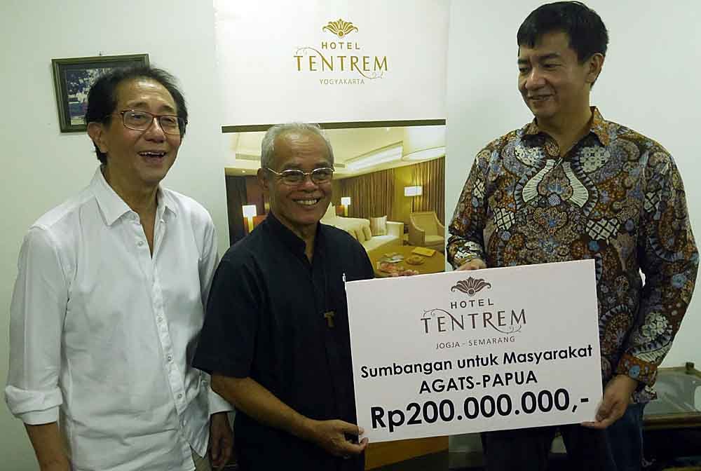 Direktur Hotel Tentrem Mario Hidayat (kanan) didampingi Direktur Utama Candi Baru (Hotel Tentrem) Irwan Hidayat menyerahkan sumbangan dana sebesar Rp.200 Juta kepada Uskup Agats Mgr. Aloysius Murwito (tengah) di Panti Asuhan Vincentius Putera, Jakarta Pusat. Sebagai bentuk kepedulian terhadap kondisi masyarakat Agats di Papua, Hotel Tentrem Jogja-Semarang menyumbang dana sebesar Rp.200 Juta yang disalurkan melalui keuskupan Agats.(Bisnis Jakarta/ADE)