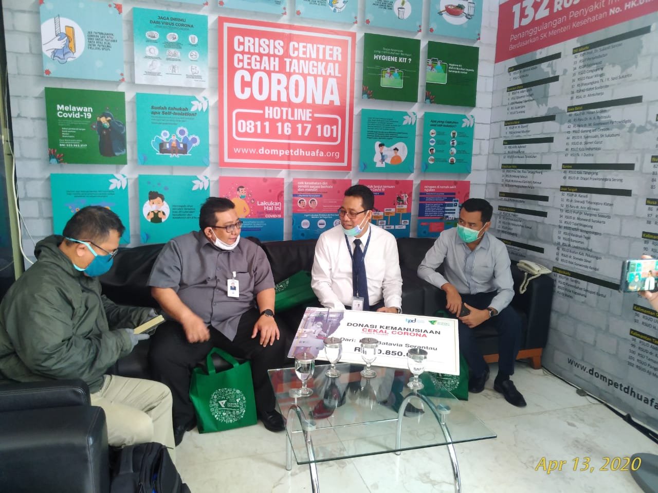 Bantuan diserahkan oleh Ketua Batavia Serantau Deddy Samsurizal yang juga Pemimpin Bank Riau Jakarta bersama Fachrudin Arif, Pemimpin Bank Jateng serta Deny Irfani (Pemimpin Bank Kaltimtara) Jakarta kepada Dhoni Marla, Direktur Remobilisasi ZIS Dompet Dhuafa di Philantrophy Building  Dhuafa di Jalan Warung Jati Barat Jakarta Selatan, Senin (13/4).