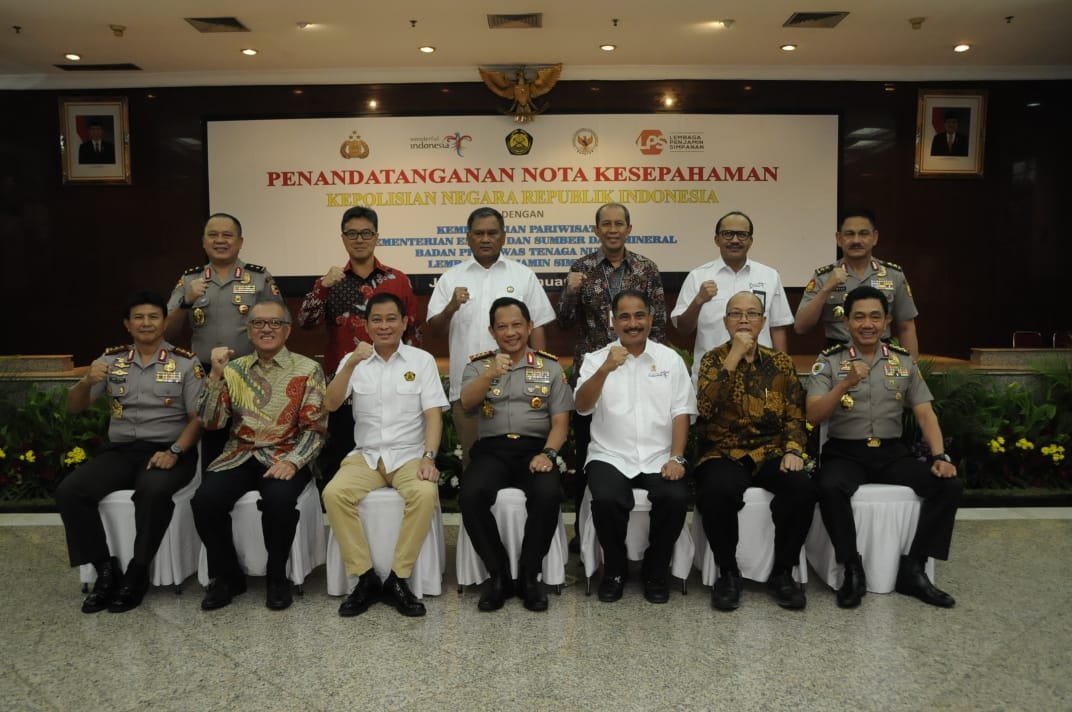 Sementara itu Kapolri Tito Karnavian dalam sambutannya mengatakan, empat sektor yang menandatangani Nota Kesepahaman hari ini adalah sektor ESDM, finansial, pernukliran, dan pariwisata sebagai primadona di masa depan. “Indonesia adalah negara yang sangat potensial pariwisatanya, terutama adalah eco-destination dan top world destination untuk diving. Hawaii boleh hebat tapi tidak akan sehebat Bali. Wisata kuliner kita juga handal mulai dari rendang, gado-gado, rawon, kita semua punya. Sektor pariwisata ini investasinya termasuk yang paling murah dibanding sektor yang lain tapi berdampak besar. Revolusi digital 4.0 itu akan merubah semua, dengan digitalisasi ada kemungkinan memangkas jumlah tenaga kerja, tapi sektor pariwisata justru sebaliknya menyerap tenaga kerja yang banyak,” kata Kapolri Tito Karnavian.
