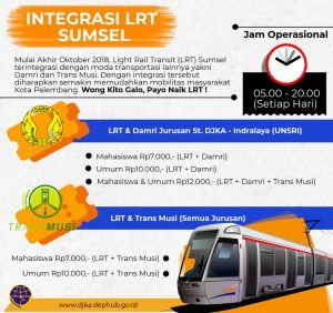 Selain itu, tarif yang dikenakan kini lebih murah dibandingkan tarif sebelum pelaksanaan uji coba ini. Sebagai perbandingan, mahasiswa yang hendak menuju ke Indralaya, sebelum uji coba ketika naik LRT Sumsel di Stasiun DJKA kemudian berpindah naik bus Damri total tarif yang harus dibayarkan semula sebesar Rp 13.000, dengan rincian tarif LRT sebesar Rp 5.000 kemudian dan bus Damri sebesar Rp 8.000. Pada saat uji coba ini, mahasiswa yang menuju Indralaya cukup membayar tarif integrasi sekali saja sebesar Rp. 7.000. Lebih lanjut, penumpang yang telah membeli tiket integrasi tersebut dapat langsung melanjutkan perjalanan menggunakan moda berikutnya.