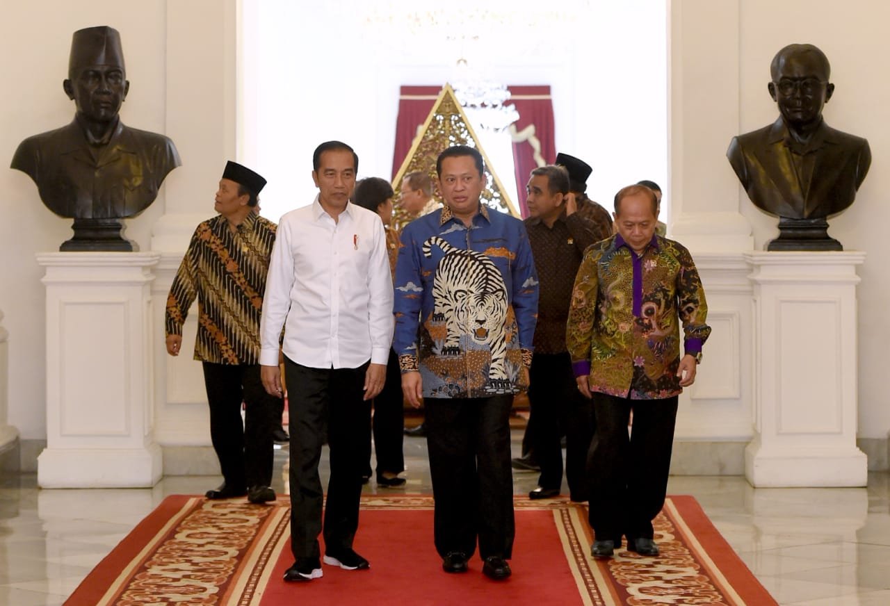 Presiden Joko Widodo menerima pimpinan Majelis Permusyawaratan Rakyat (MPR) yang diketuai Bambang Soesatyo di Istana Merdeka, Jakarta, Rabu (16/10).