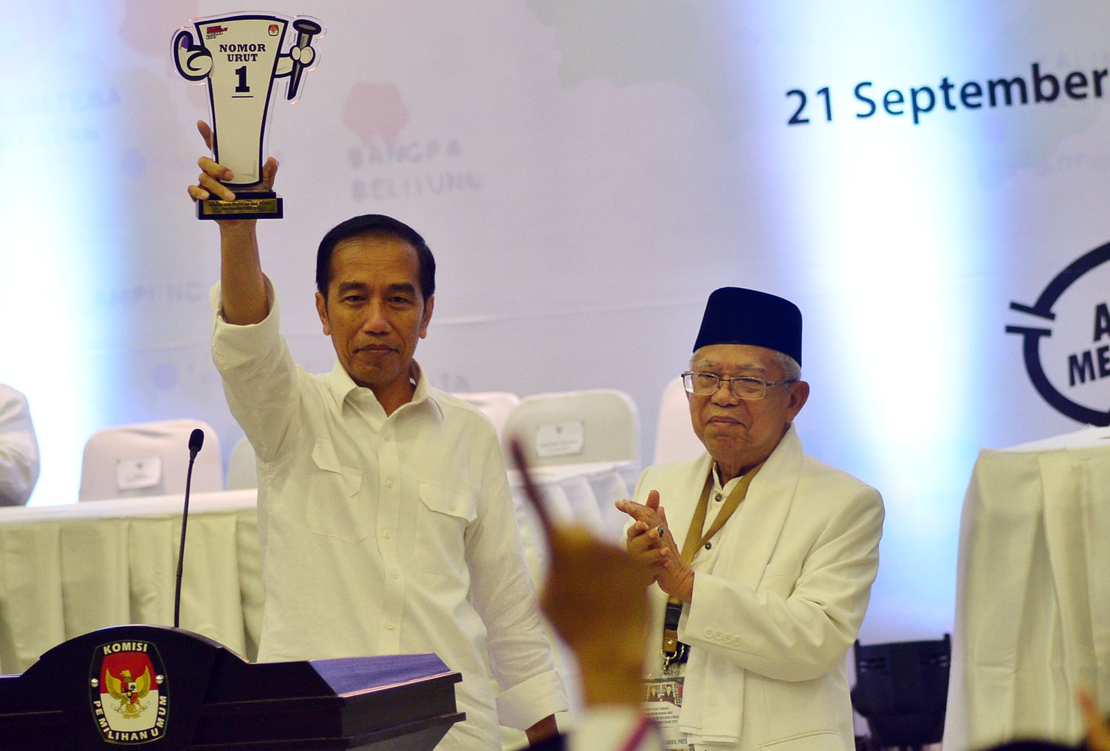 Pasangan Joko Widodo-Ma’ruf Amin mendapat nomor urut satu sebagai peserta Pemilu Presiden 2019 saat pengundian nomor urut calon presiden-calon wakil presiden yang dilakukan di Kantor Komisi Pemilihan Umum (KPU), Jakarta Pusat, Jumat (21/9/18) malam.(Bisnis Jakarta/ADE)