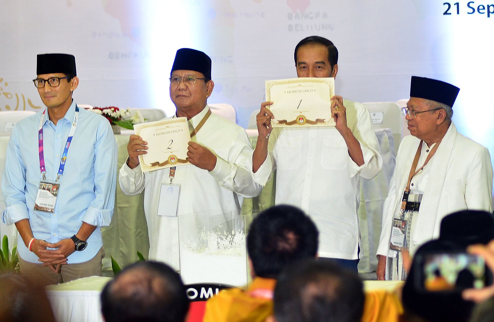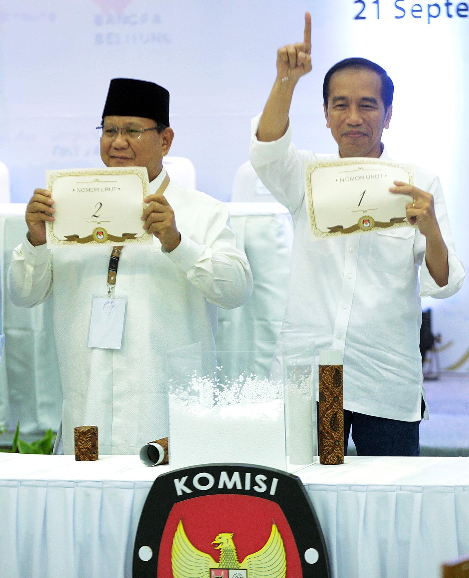Pasangan Joko Widodo-Ma'ruf Amin mendapat nomor urut satu dan pasangan Prabowo Subianto-Sandiaga Uno mendapat nomor urut dua sebagai peserta Pemilu Presiden 2019 saat pengundian nomor urut calon presiden-calon wakil presiden yang dilakukan di Kantor Komisi Pemilihan Umum (KPU), Jakarta Pusat, Jumat (21/9/18) malam.(Bisnis Jakarta/ADE)