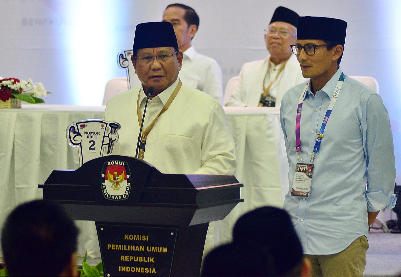Pasangan Joko Widodo-Ma’ruf Amin mendapat nomor urut satu dan pasangan Prabowo Subianto-Sandiaga Uno mendapat nomor urut dua sebagai peserta Pemilu Presiden 2019 saat pengundian nomor urut calon presiden-calon wakil presiden yang dilakukan di Kantor Komisi Pemilihan Umum (KPU), Jakarta Pusat, Jumat (21/9/18) malam.(Bisnis Jakarta/ADE)
