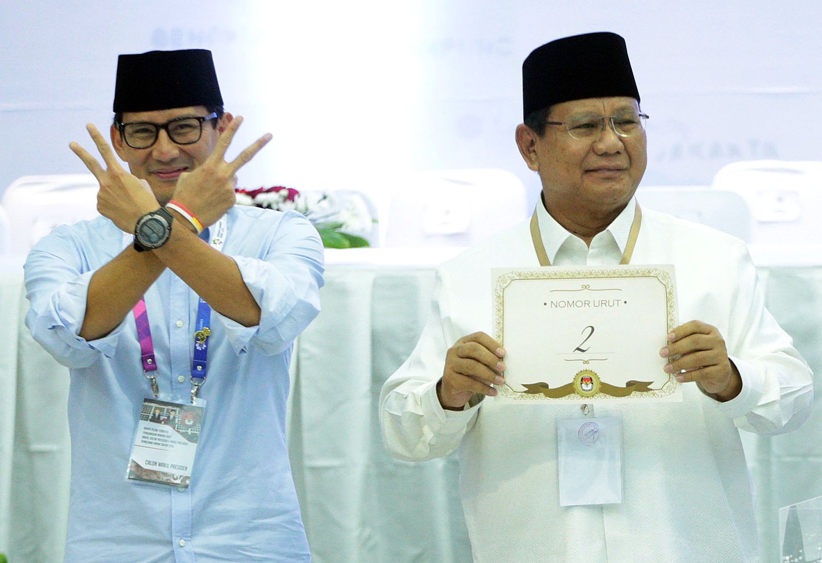 Pasangan Prabowo Subianto-Sandiaga Uno mendapat nomor urut dua sebagai peserta Pemilu Presiden 2019 saat pengundian nomor urut calon presiden-calon wakil presiden yang dilakukan di Kantor Komisi Pemilihan Umum (KPU), Jakarta Pusat, Jumat (21/9/18) malam.(Bisnis Jakarta/ADE)