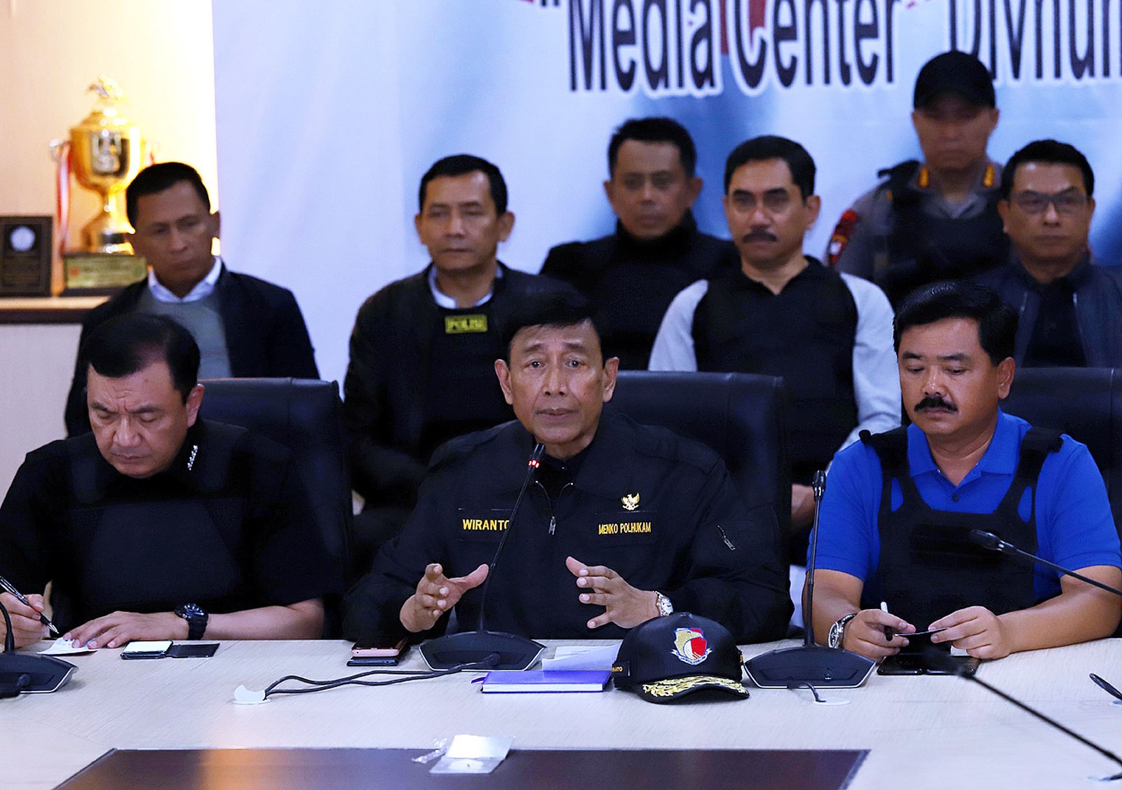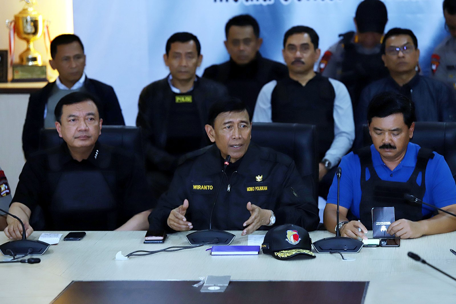 Menko Polhukam Wiranto (tengah) didampingi Panglima TNI Jenderal TNI Hadi Tjahjanto (kanan), Kepala BIN Budi Gunawan (kiri) memberikan keterangan kepada wartawan mengenai penanggulangan pascakerusuhan di rutan cabang salemba Mako Brimob Kelapa Dua, Depok, Jawa Barat, Kamis (10/5/18). Sebanyak 155 tahanan teroris menyerah setelah dilakukan tindakan. Selanjutnya para tahanan teroris itu dibawa ke Lapas Nusakambangan.(Bisnis Jakarta/ADE)