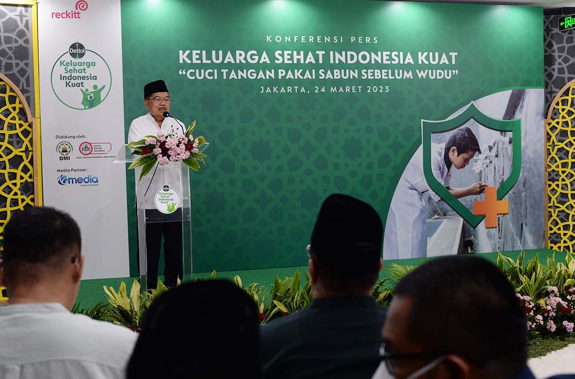Ketua Dewan Masjid Indonesia (DMI) Jusuf Kalla saat meluncurkan kampanye Keluarga Sehat, Indonesia Kuat, di Jakarta. Menyambut tingginya antusiasme masyarakat Indonesia, terutama umat Muslim dalam menjalankan Ibudah Puasa Ramadhan pertama usai pandemi, Reckitt Indonesia melalui merek Dettol meluncurkan kampanye Keluarga Sehat, Indonesia Kuat.