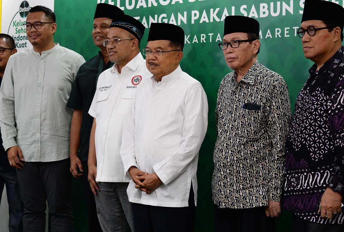 Ketua Dewan Masjid Indonesia (DMI) Jusuf Kalla bersama didampingi sejumlah pengurus DMI bersama Head of External Communications and Community Affairs Reckitt Indonesia, Donny Wahyudi (kiri), Marketing Director Reckitt Indonesia, Rahul Bibhuti (media kiri), Ketua Umum Pengurus Besar Ikatan Dokter Indonesia (IDI), dr. M. Adib Khumaidi, Sp.OT (ketiga kiri) saat meluncurkan kampanye Keluarga Sehat, Indonesia Kuat, di Jakarta. Menyambut tingginya antusiasme masyarakat Indonesia, terutama umat Muslim dalam menjalankan Ibudah Puasa Ramadhan pertama usai pandemi, Reckitt Indonesia melalui merek Dettol meluncurkan kampanye Keluarga Sehat, Indonesia Kuat.