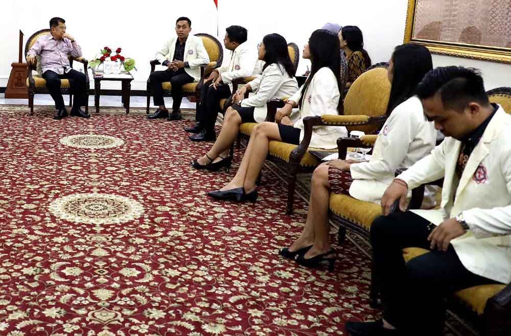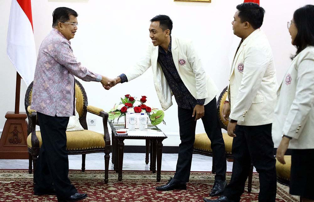 Wapres Jusuf Kalla meneriman Ketua Presedium Pimpinan Pusat Kesatuan Mahasiswa Hindu Dharma Indinesia (KMHDI) I Kadek Andre Nuada (2kiri) didampingi Sekjen Pimpinan Pusat KMHDI I Made Sudana Yasa (2kanan) di kantor Wapres, Jakarta Pusat, Senin (1/4/2019). KMHDI sebagai organisasi mahasiswa yang menjalankan berbagai program, yaitu di bidang pendidikan, sosial, dan enterpreneurship tersebut menyampaikan undangan kepada Wapres Jusuf Kalla untuk hadir dalam rakornas KMHDI yang akan diselenggarakan pada tanggal 30 Agustus 2019 di Palangkaraya.(Bisnis Jakarta/ADE)