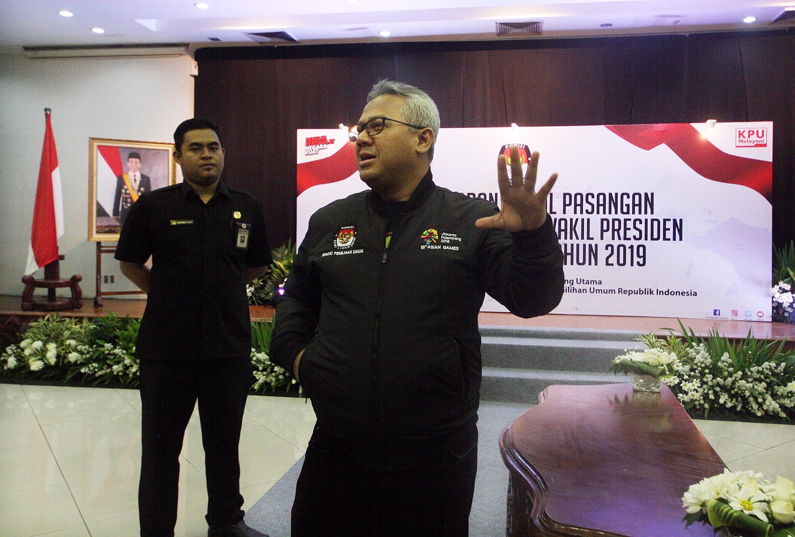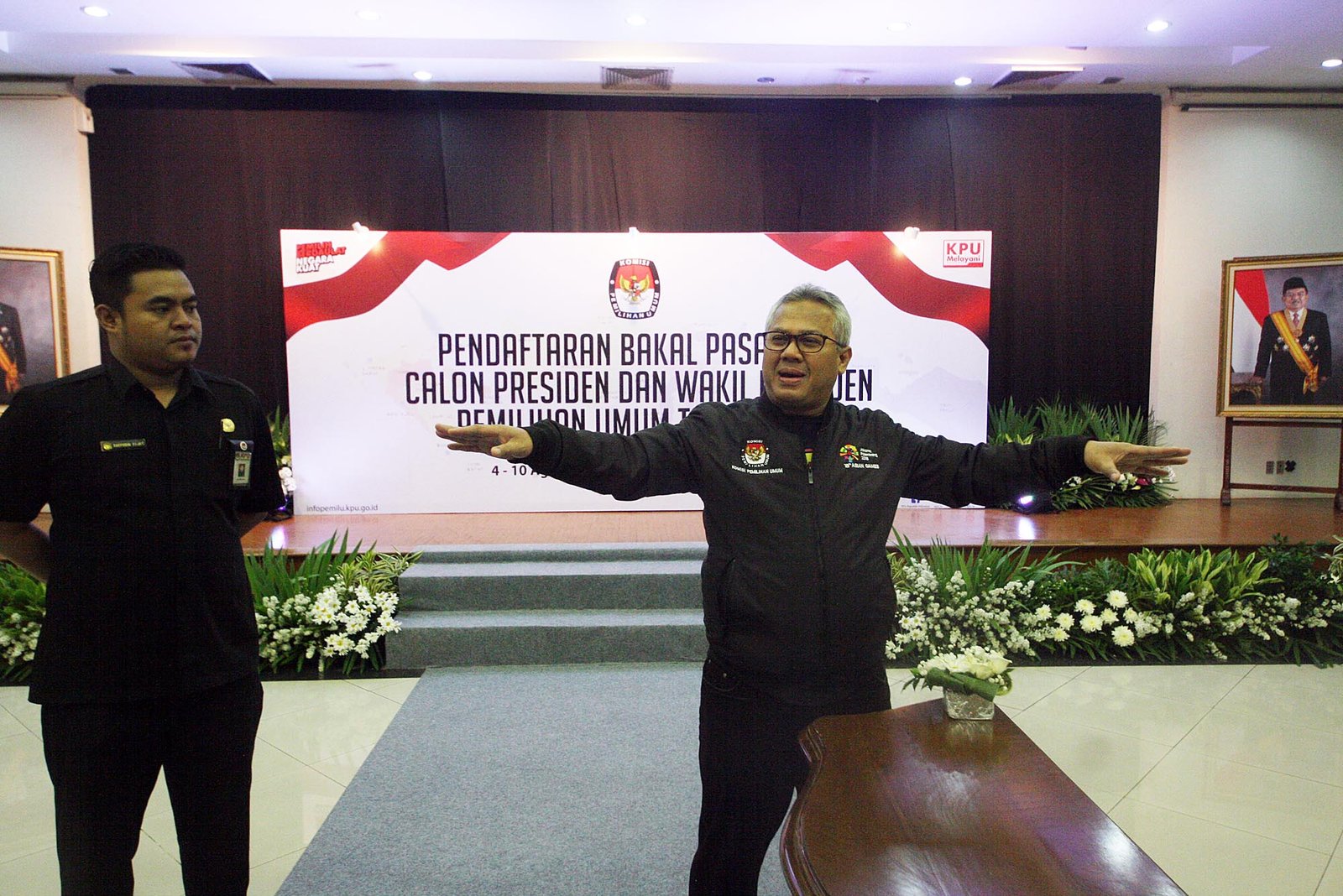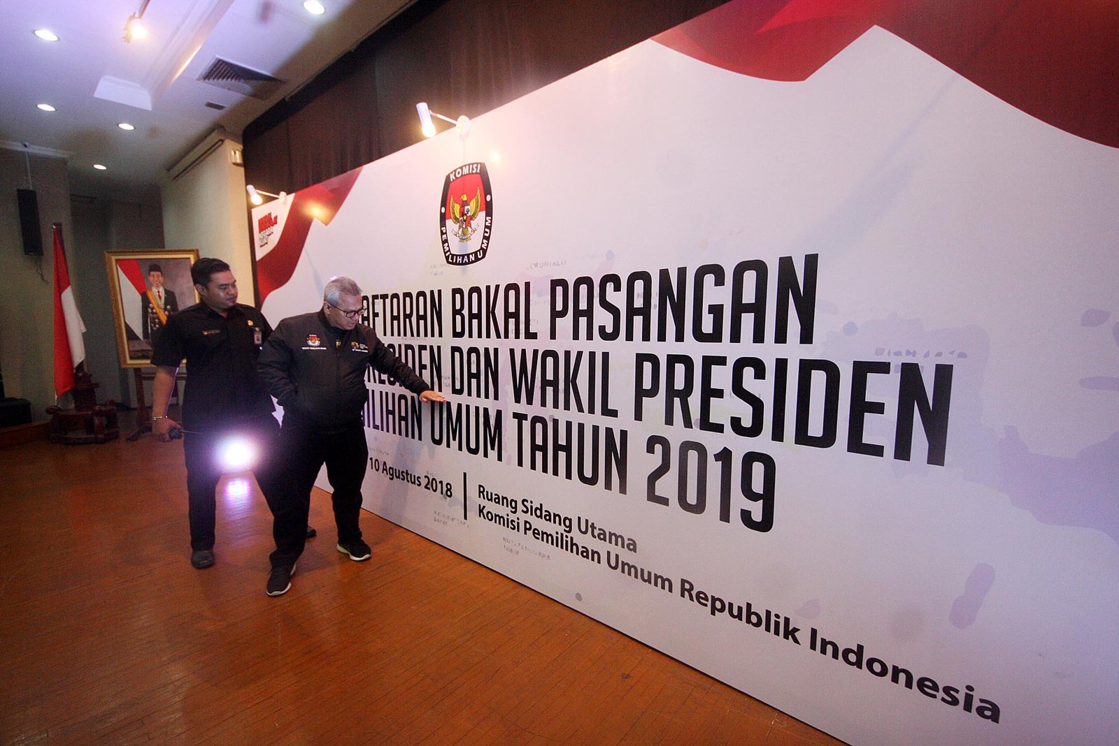 Ketua Komisi Pemilihan Umum (KPU) Arief Budiman meninjau ruang pendaftaran bakal pasangan Capres dan Cawapres Pemilu Tahun 2019 di Kantor KPU, Jakarta Pusat, Sabtu (4/8/18). KPU resmi membuka pendaftaran bakal pasangan capres dan cawapres tersebut mulai 4 – 10 Agustus mendatang.(Bisnis Jakarta/ADE)