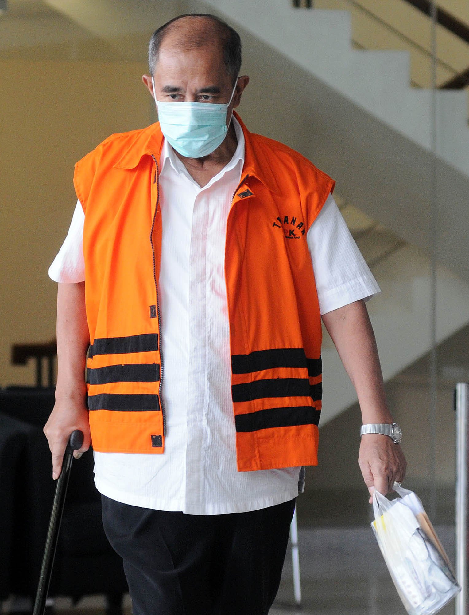 Bupati Bandung Barat nonaktif Abubakar mengenakan tongkat usai menandatangani berkas perpanjangan penahanan 40 hari kedepan di gedung Komisi Pemberantasan Korupsi (KPK), Kuningan, Jakarta Selatan, Selasa (10/7/18). Abubakar menandatangani berkas perpanjangan penahanan terkait dugaan penerima suap dari sejumlah kepala dinas untuk keperluan politik istrinya, Elin Suharliah sebagai calon Bupati Bandung Barat dalam Pilkada 2018.(Bisnis Jakarta/ADE)
