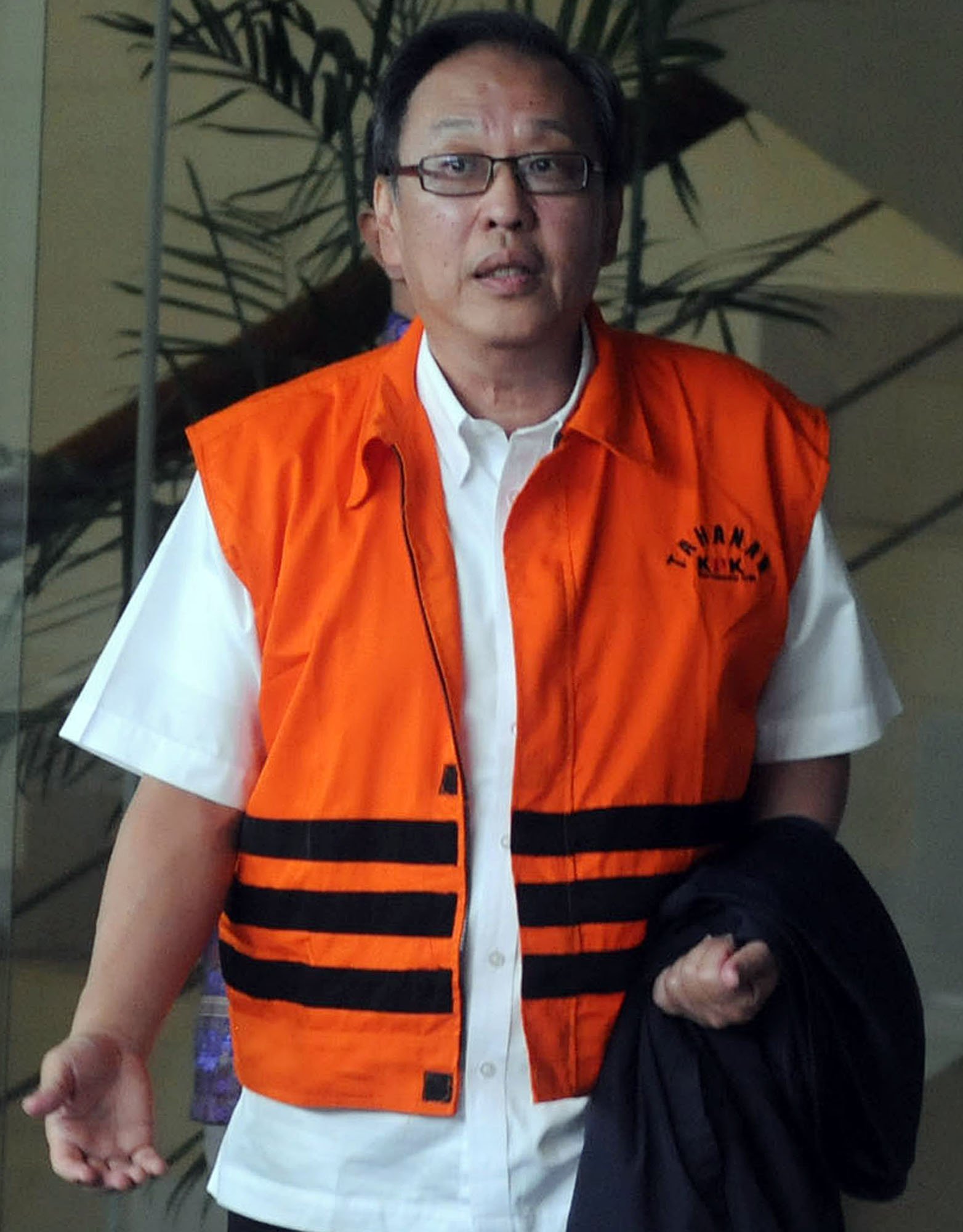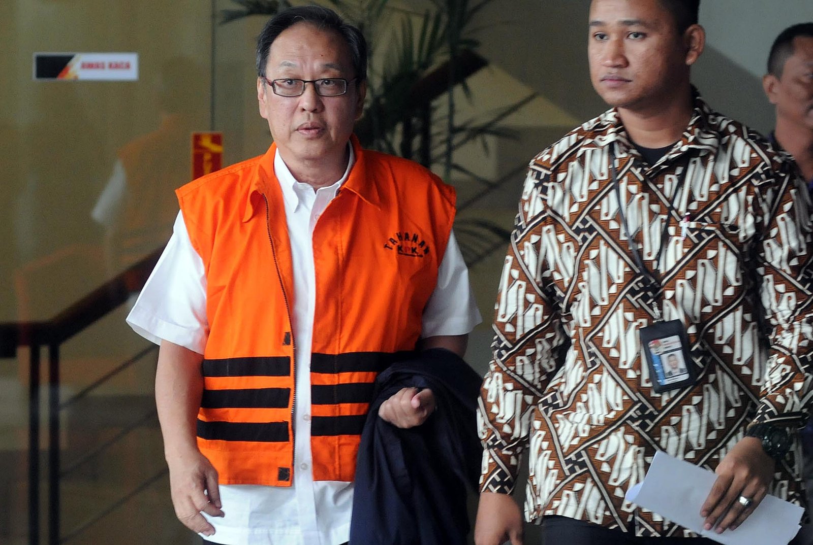 Pengusaha yang juga tersangka dalam kasus dugaan korupsi proyek pengadaan KTP elektronik (e-KTP), Made Oka Masagung usai menandatangani berkas perpanjangan penahanan di gedung Komisi Pemberantasan Korupsi (KPK), Kuningan, Jakarta Selatan, Jumat (20/4/18). Made Oka yang terjerat kasus dugaan korupsi proyek pengadaan e-KTP diduga memiliki perusahaan PT Delta Energy, yakni perusahaan di bidang investasi yang berlokasi di Singapura. Perusahaan tersebut diduga menjadi perusahaan penampung dana korupsi e-KTP.(Bisnis Jakarta/ADE)