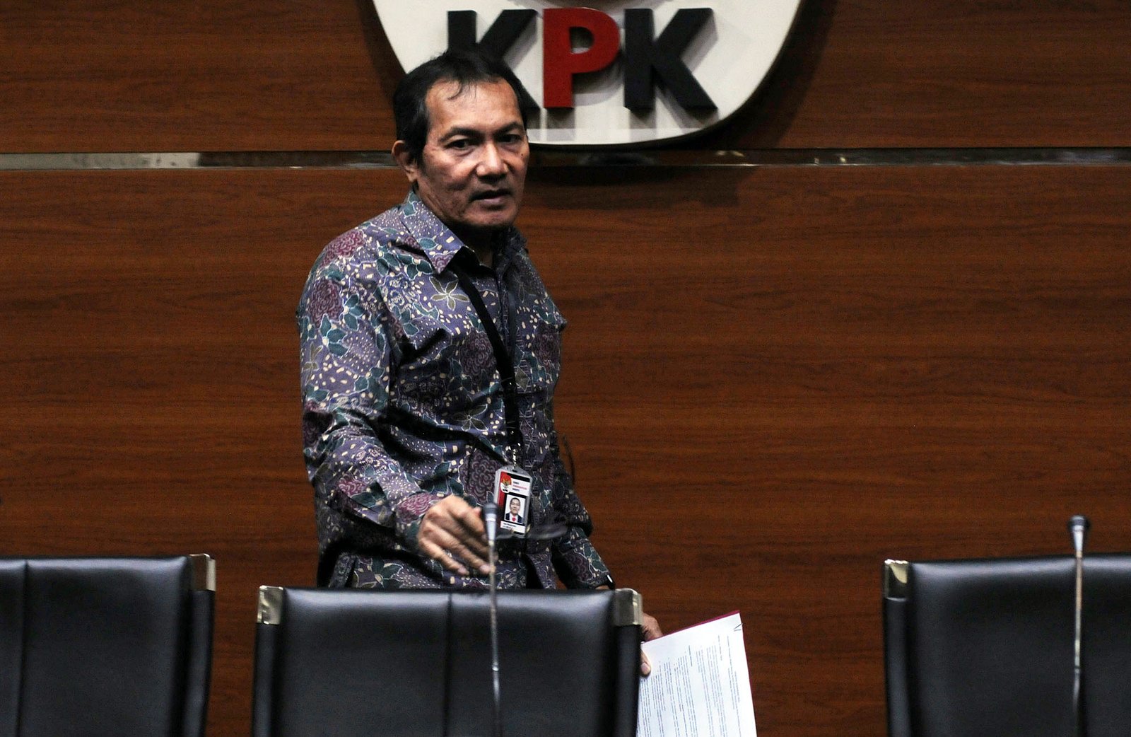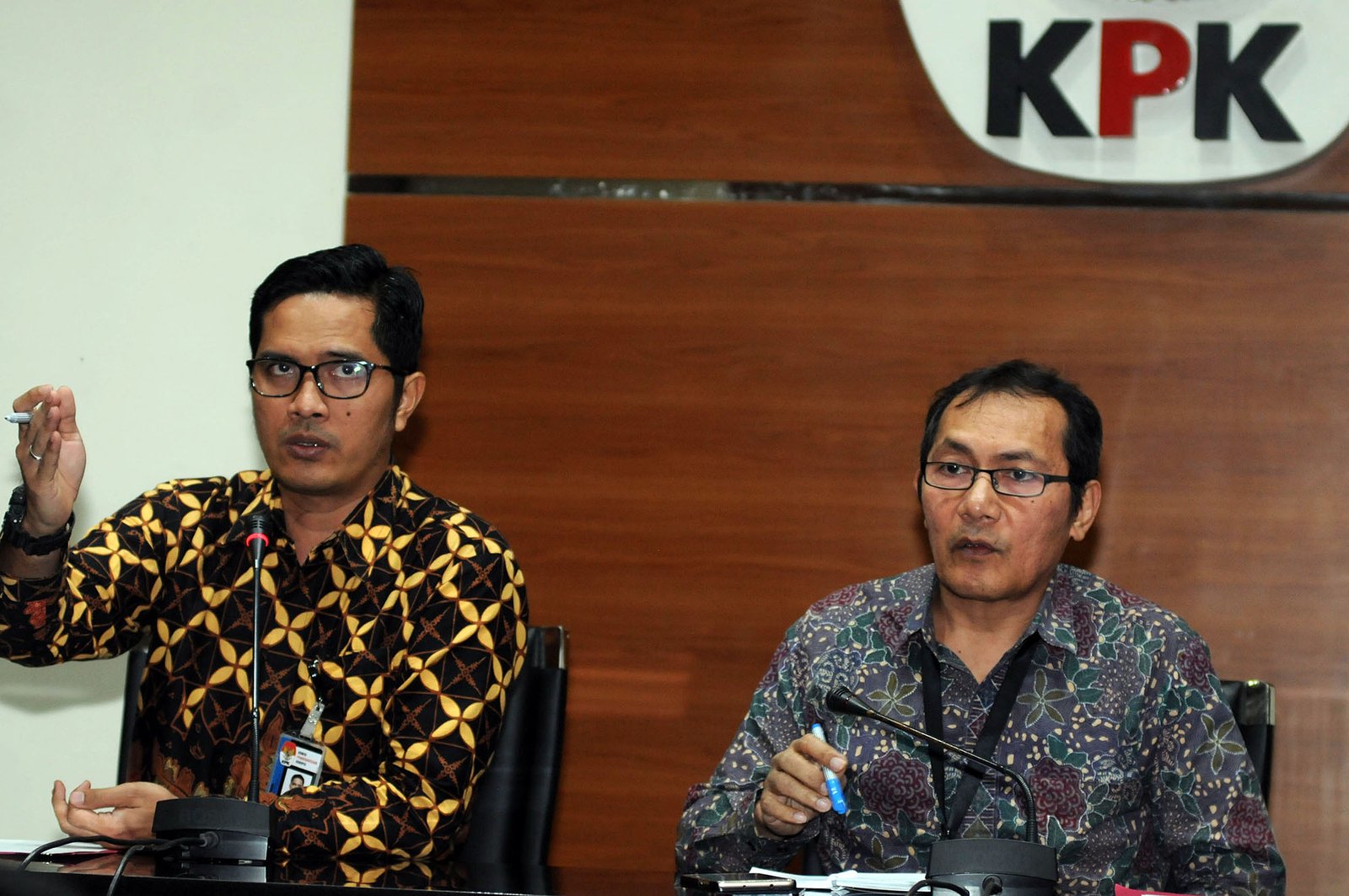 Wakil Ketua Komisi Pemberantasan Korupsi (KPK) Saut Situmorang didampinggi juru bicara KPK Febri Diansyah (kiri) memberikan keterangan perkembangan kasus di Kabupaten Malang di gedung KPK, Kuningan, Jakarta Selatan, Kamis (11/10/18). KPK mengumumkan penetapan tersangka Bupati Malang Rendra Kresna diduga menerima suap terkait penyediaan sarana Dinas Pendidikan Pemerintah Kabupaten Malang sebesar Rp 3,45 miliar dan menerima gratifikasi sekitar Rp 3,55 miliar. KPK juga menetapkan tersangka dari pihak swasta Ali Murtopo dan Eryk Armando Talla.(Bisnis Jakarta/ADE)