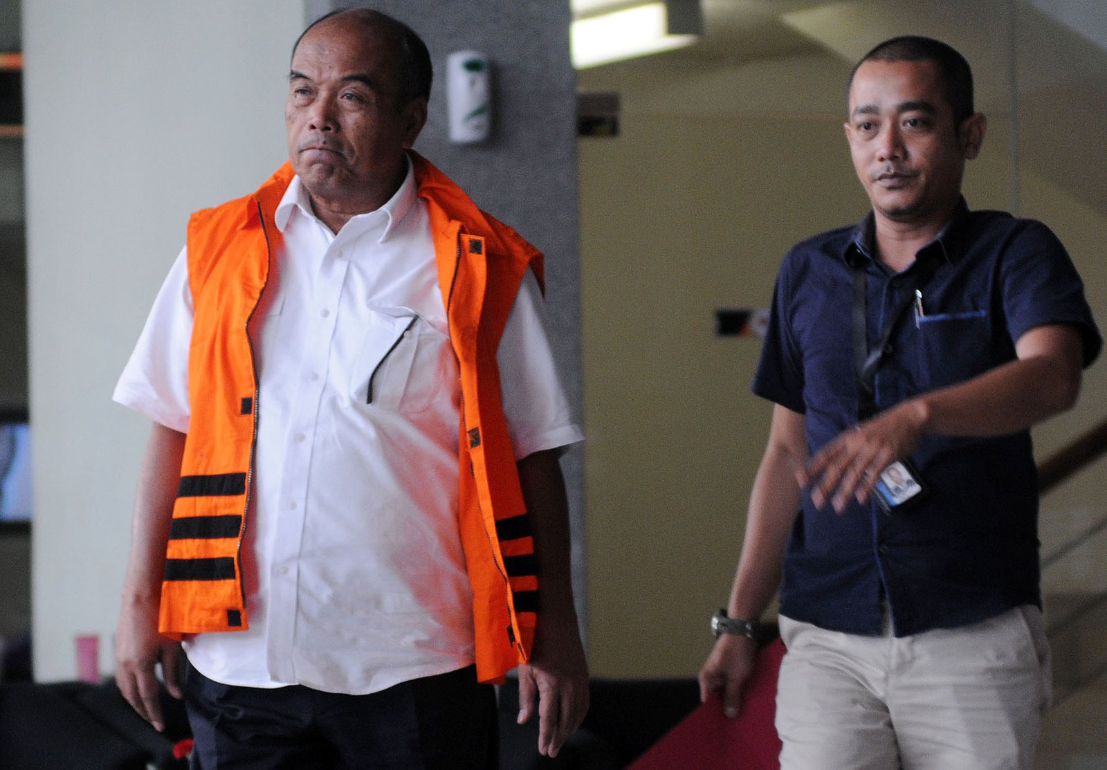 Mantan Dirut PT Asuransi Jasa Indonesia (Jasindo), Budi Tjahjono memakai rompi tahanan usai diperiksa penyidik Komisi Pemberantasan Korupsi (KPK) di Kuningan, Jakarta Selatan, Senin (16/7/18). Penyidik KPK menahan Budi Tjahjono untuk mempermudah pemeriksaan terkait dugaan korupsi fiktif agen Jasindo dalam pengadaan asuransi ‘oil and gas’ pada BP Migas-KKKS tahun 2010-2012 dan 2012-2014.(Bisnis Jakarta/ADE)
