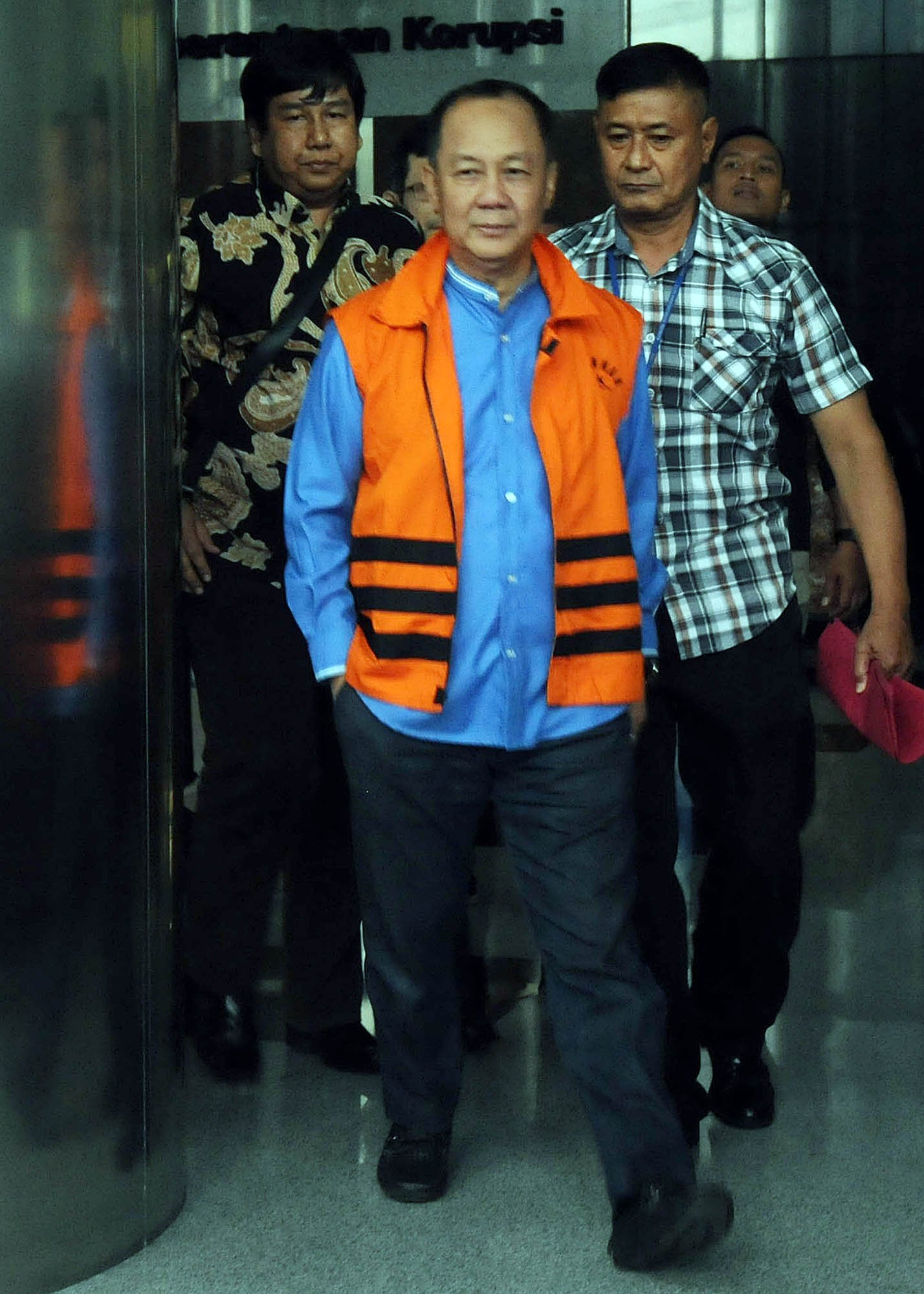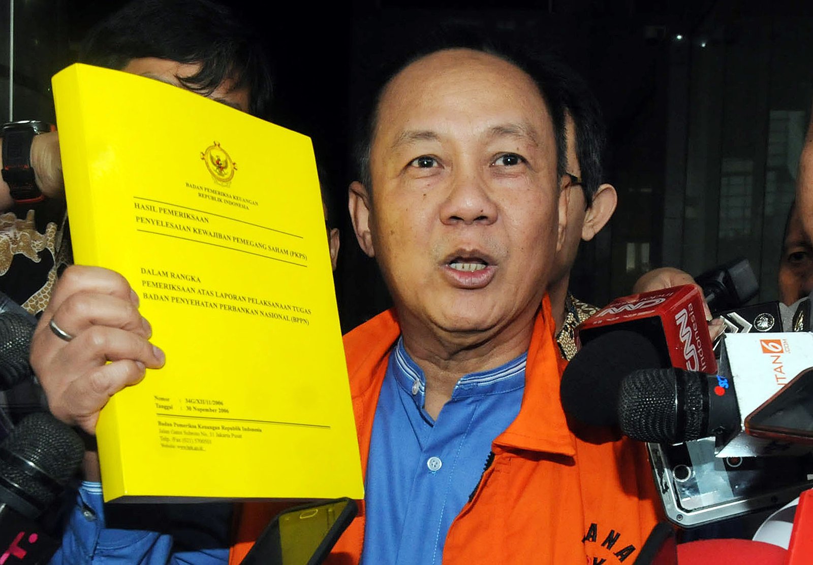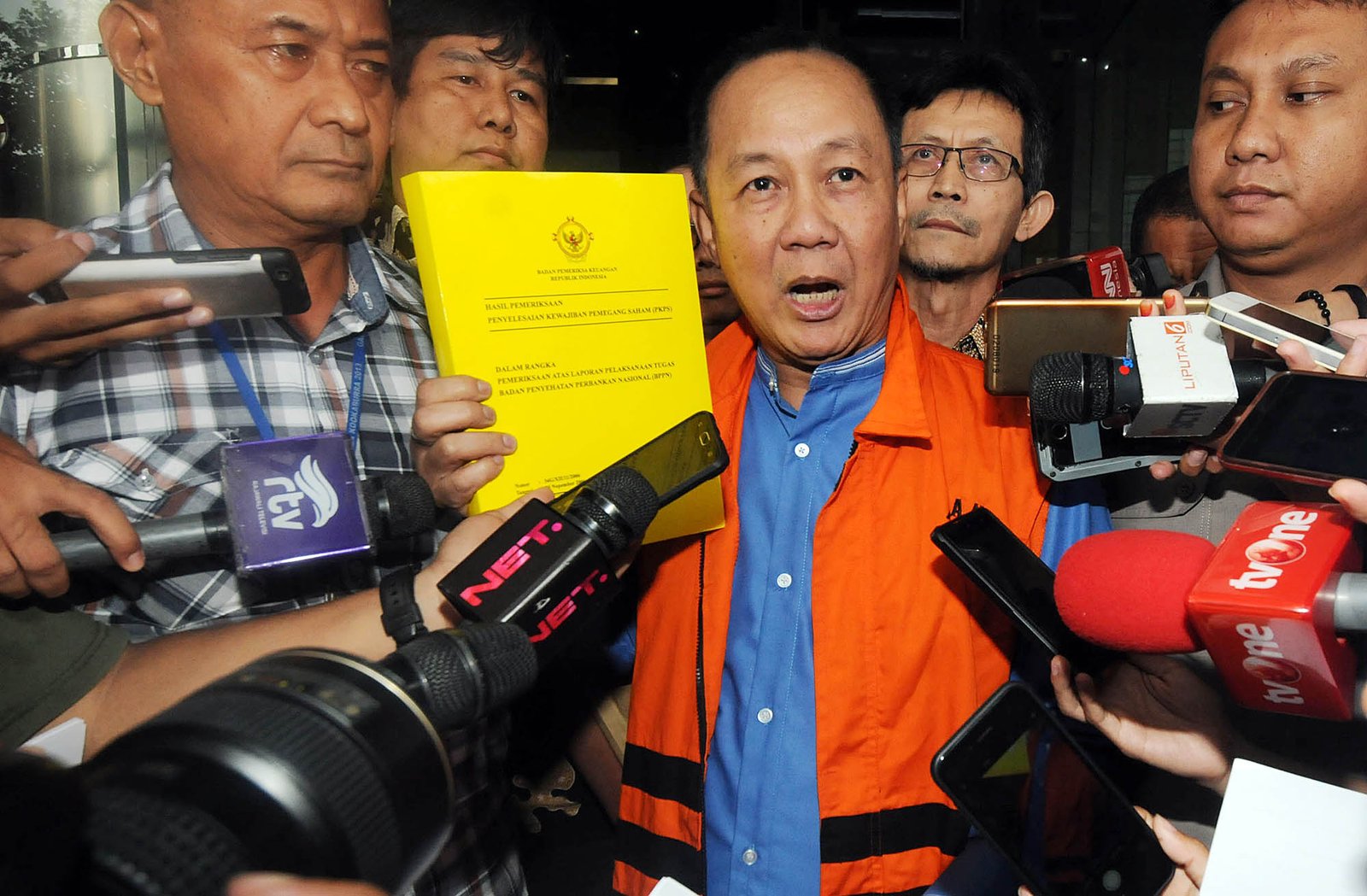 Mantan Ketua Badan Penyehatan Perbankan Nasional (BPPN) Syafruddin Arsyad Temenggung mengunakan rompi tahanan usai menjalani pemeriksaan penyidik Komisi Pemberantasan Korupsi (KPK) di Kuningan, Jakarta Selatan, Kamis (21/12). Syafruddin Arsyad Temenggung resmi ditahan KPK untuk 20 hari kedepan terkait dugaan korupsi penerbitan surat keterangan lunas (SKL) Bantuan Likuiditas Bank Indonesia (BLBI).(Bisnis Jakarta/ADE)