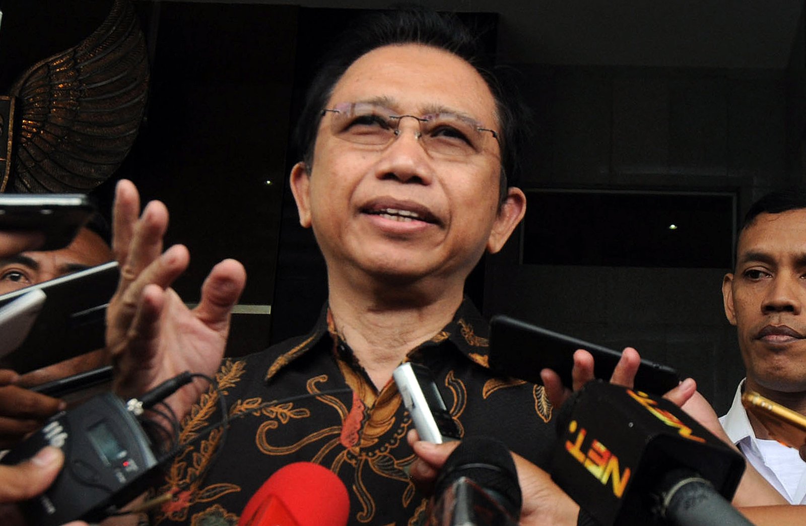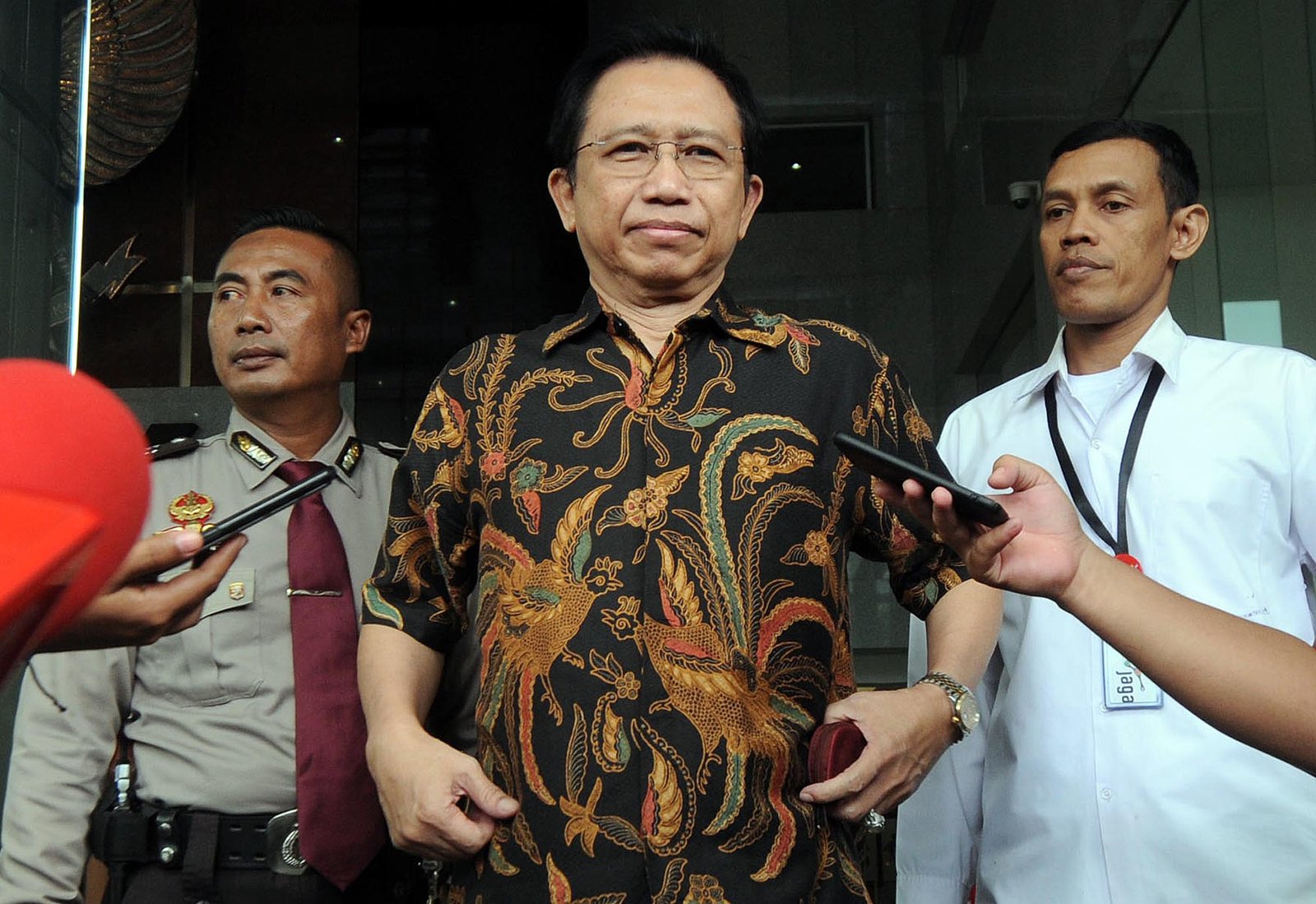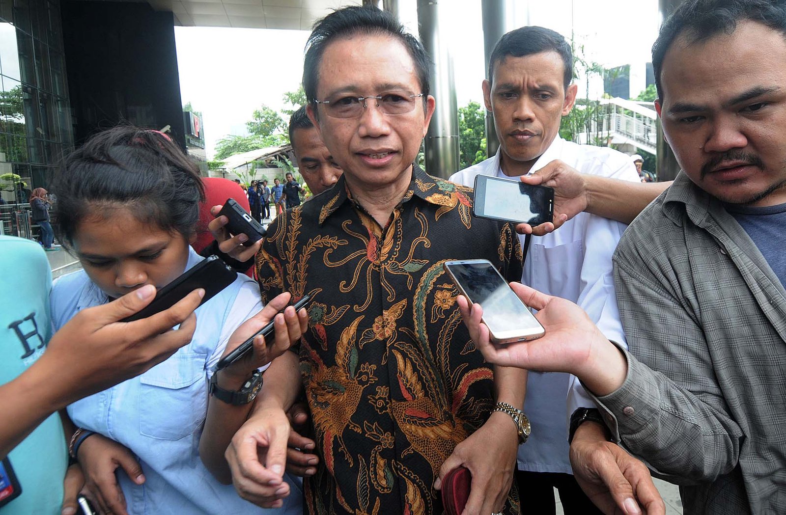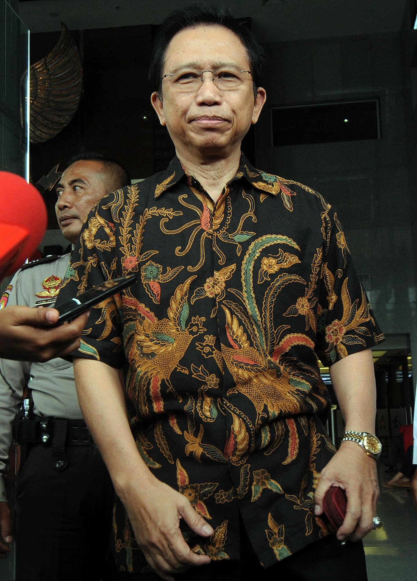 DPR Marzuki Alie usai menjalani pemeriksaan penyidik Komisi Pemberantasan Korupsi (KPK) di Kuningan, Jakarta Selatan, Senin (8/1). Marzuki Alie diperiksa sebagai saksi terkait kasus korupsi pengadaan KTP Elektronik dengan tersangka Anang Sugiana Sudiharjo.(Bisnis Jakarta/ADE)