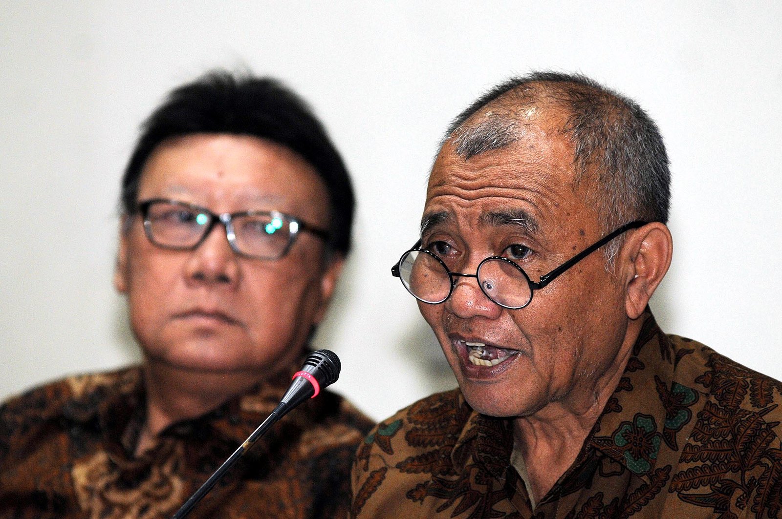 Ketua Komisi Pemberantasan Korupsi (KPK) Agus Rahardjo (kanan) bersama Menteri Dalam Negeri (Mendagri) Tjahjo Kumolo (kiri) memberikan keterangan kepada wartawan usai melakukan pertemuan terkait penegakan hukum di lingkungan Aparatur Sipil Negara (ASN) di gedung KPK, Kuningan, Jakarta Selatan, Selasa (4/9/18). Pertemuan tersebut untuk menanggapi banyaknya ASN yang tersandung masalah kasus korupsi seperti yang menimpa 41 anggota DPRD Kota Malang.(Bisnis Jakarta/ADE)