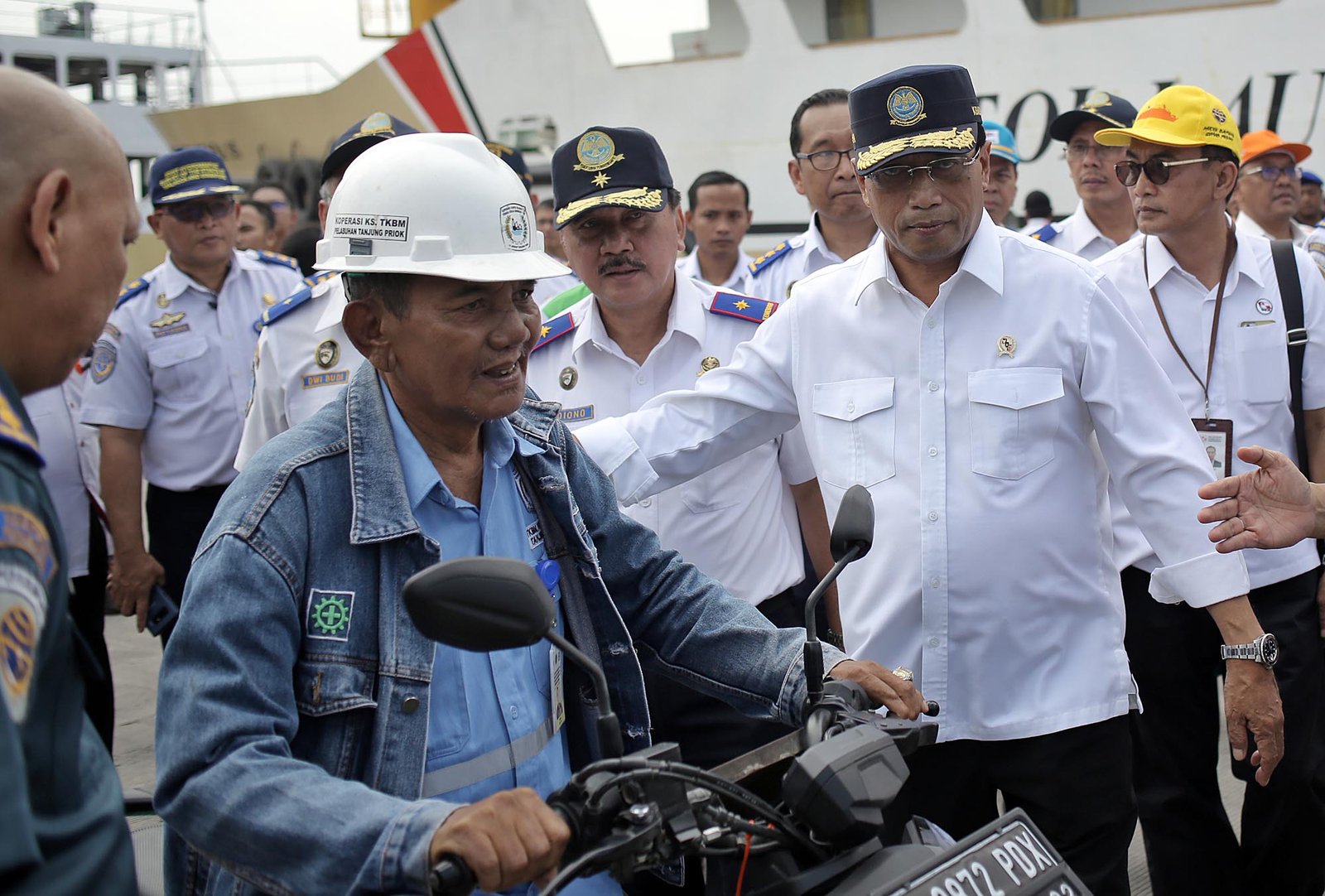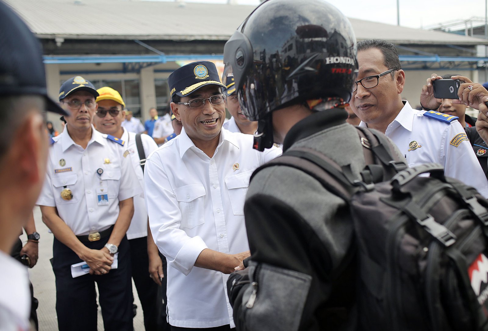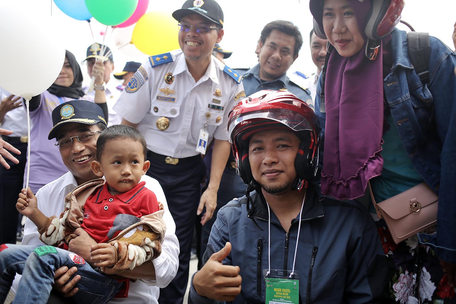 Menteri Perhubungan Budi Karya Sumadi menyambut kedatangan peserta mudik gratis arus balik dari Semarang ke Jakarta di Pelabuhan Tanjung Priok, Jakarta Utara, Rabu (20/6/18).(Bisnis Jakarta/ADE)