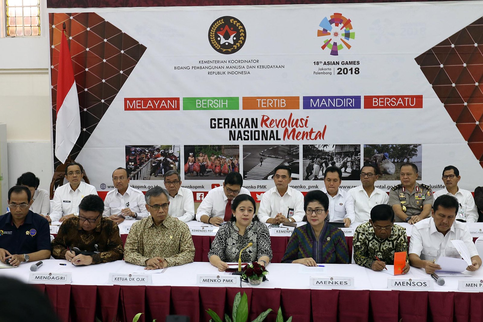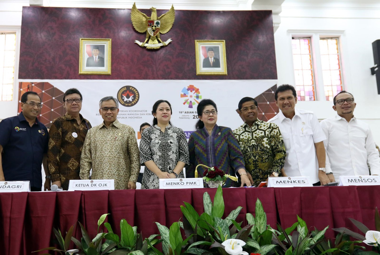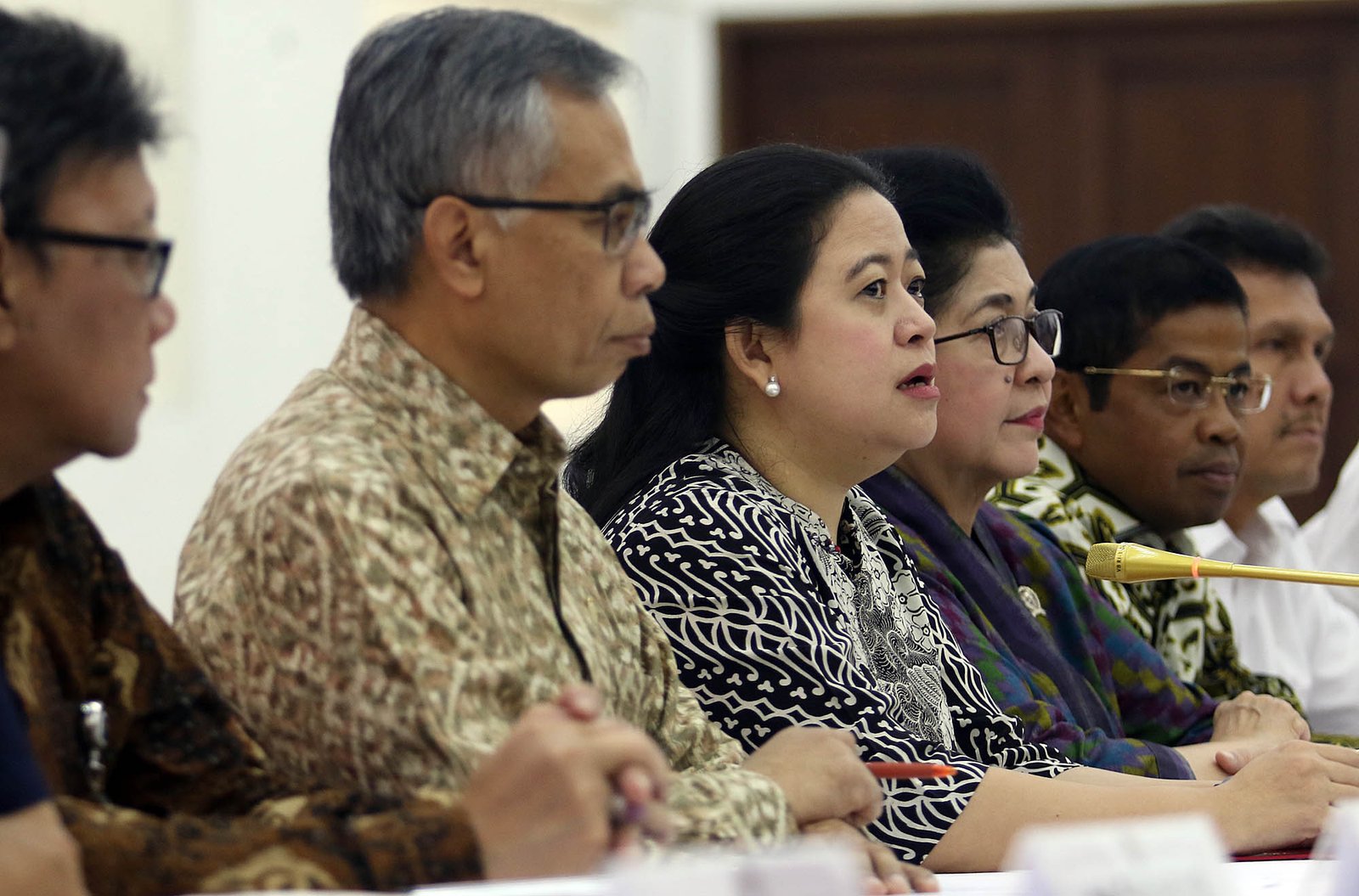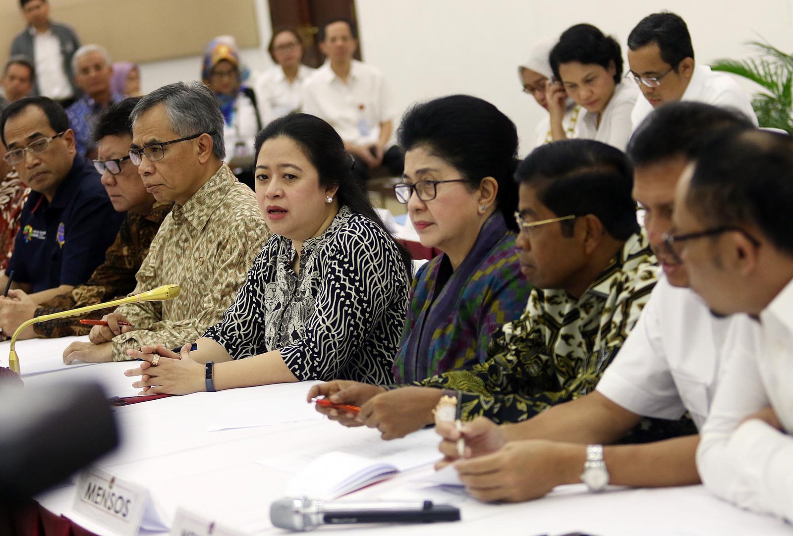 Menko PMK Puan Maharani bersama Menteri Kesehatan Nila Djuwita M (4kanan), Menteri Sosial Idrus Marhman (3kanan), Menteri PAN-RB Asman Abnur (2kanan), Menteri Ketenagakerjaan H.Hanif Dhakiri (kanan), Menteri Perhubungan Budi Karya Soemadi (kiri), Mendagri Cahyo Kumolo (2kiri), Ketua OJK Wimboh Santoso (3kiri) saat jumpa pers soal Cuti Bersama Lebaran di kantor Kemenko PMK, Jakarta Pusat, Senin (7/5/18). Pemerintah melalui Kementerian Koordinator Bidang Pembangunan Manusia dan Kebudayaan (PMK) memutuskan jumlah hari cuti bersama Lebaran 2018 tetap ikuti Surat Keputusan Bersama (SKB) 3 Menteri. Dalam SKB itu diputuskan cuti bersama sebanyak tujuh hari sehingga total libur Lebaran menjadi 10 hari pada 11-20 Juni 2018.(Bisnis Jakarta/ADE)