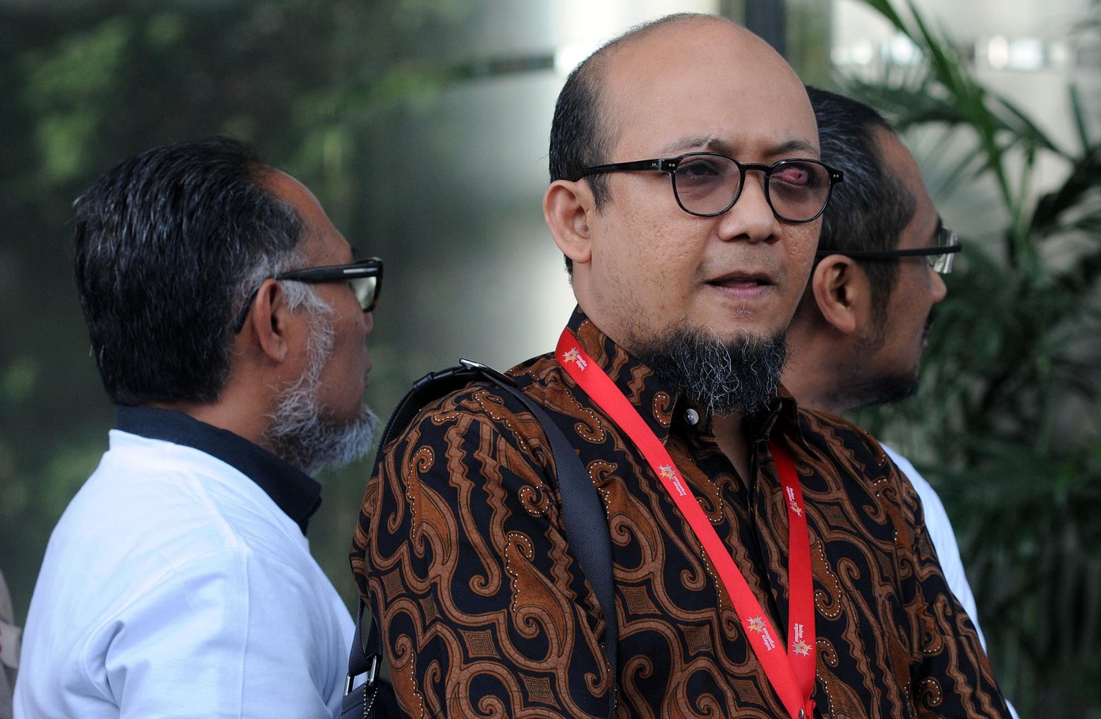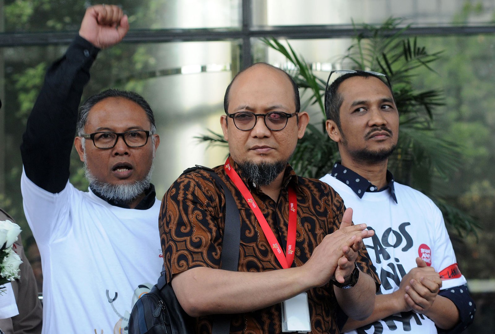 Penyidik senior Komisi Pemberantasan Korupsi (KPK) Novel Baswedan disambut mantan Ketua KPK Abraham Samad (kanan), mantan Wakil Ketua KPK Bambang Widjojanto (kiri) dan para pegawai serta aktivis antaikorupsi saat tiba di gedung KPK, Kuningan, Jakarta Selatan, Jumat (27/7/18). Novel Baswedan yang tetap akan bertugas sebagai Kepala Satuan Tugas di Direktorat Penyidikan Kedeputian Bidang Penindakan KPK tersebut absen selama 16 bulan untuk berobat menyembuhkan matanya setelah disiram air keras oleh orang tak dikenal seusai menjalankan shalat subuh di masjid dekat kediamannya, pada 11 April 2017 lalu.(Bisnis Jakarta/ADE)