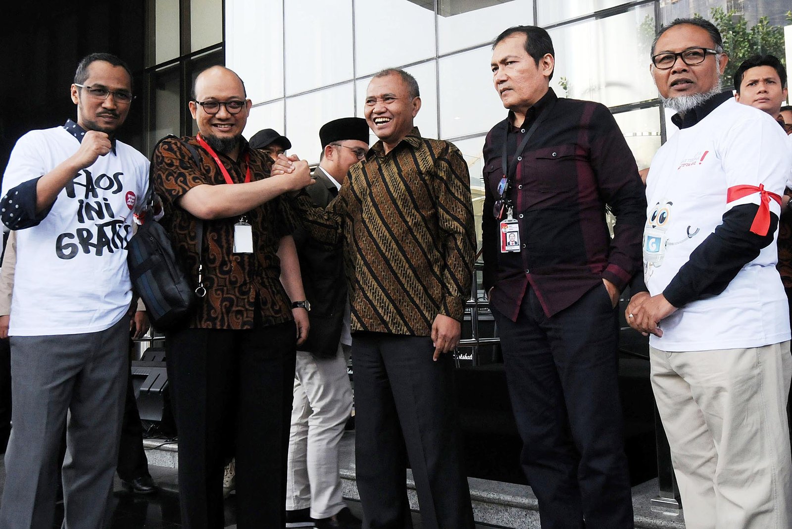 Penyidik senior Komisi Pemberantasan Korupsi (KPK) Novel Baswedan disambut Ketua KPK Agus Rahardjo (tengah), Wakil Ketua KPK Saut Situmorang (kanan), mantan Ketua KPK Abraham Samad (kiri), mantan Wakil Ketua KPK Bambang Widjojanto (kanan) dan para pegawai serta aktivis antaikorupsi saat tiba di gedung KPK, Kuningan, Jakarta Selatan, Jumat (27/7/18). Novel Baswedan yang tetap akan bertugas sebagai Kepala Satuan Tugas di Direktorat Penyidikan Kedeputian Bidang Penindakan KPK tersebut absen selama 16 bulan untuk berobat menyembuhkan matanya setelah disiram air keras oleh orang tak dikenal seusai menjalankan shalat subuh di masjid dekat kediamannya, pada 11 April 2017 lalu.(Bisnis Jakarta/ADE)