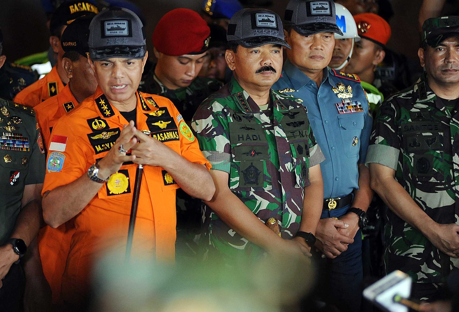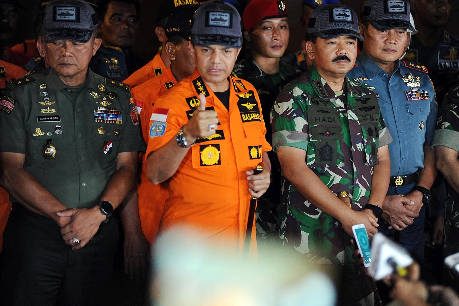 Panglima TNI Marsekal Hadi Tjahjanto bersama Kabasarnas Marsekal Madya Muhammad Syaugi memberikan keterangan kepada wartawan usai meninjau langsung proses evakuasi Lion Air JT 610 di perairan Tanjung Karawang, di posko utama evakuasi Lion Air JT610 di Dermaga JICT II, Tanjung Priok, Jakarta Utara, Rabu (31/10/18). Basarnas telah mendapatkan titik lokasi yang diduga merupakan fuselage atau bagian badan utama pesawat Lion Air JT 610 yang jatuh di Tanjung Karawang sudah terdeteksi.(Bisnis Jakarta/ADE)