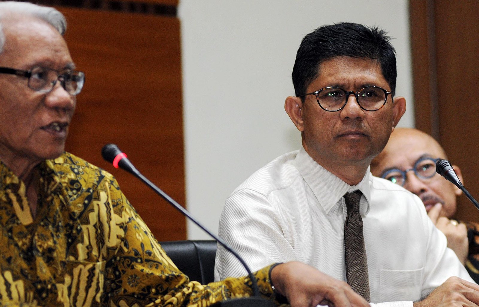 Panitia Seleksi (Pansel) calon Hakim Mahkamah Konstitusi (MK) Harjono (kiri), Wakil Ketua Komisi Pemberantasan Korupsi (KPK) Laode M Syarif (tengah) dan Anggota Pansel MK Mas Achmad Santosa (kanan) memberikan keterangan kepada wartawan usai melakukan pertemuan di gedung KPK, Kuningan, Jakarta Selatan, Senin (9/7/18). Dalam pertemuan tersebut Pansel calon Hakim MK meminta masukan kreteria 9 nama calon hakim MK, Guru Besar Tetap Hukum Administrasi Negara FH UI sekaligus mantan Anggota Dewan Kehormatan Penyelenggara Pemilu Anna Erliyana, pengajar ilmu Hukum Tata Negara Universitas Gadjah Mada Yogyakarta Enny Nurbaningsih, Dosen Ilmu Hukum Tata Negara Universitas Surabaya Hesti Armiwulan, dosen Hukum Tata Negara/Hukum Administrasi Negara Universitas Pattimura Jantje Tjiptabudy, Wakil Ketua LPSK Lies Sulistiani, Profesor Hukum Tatanegara Universitas Islam Indonesia Ni'matul Huda, guru besar Perbandingan Hukum pada Prodi Ilmu Hukum, Fakultas Syariah dan Hukum, Universitas Islam Negeri Sunan Kalijaga Yogyakarta Ratno Lukito, Dosen Ilmu Hukum Tata Negara Universitas Padjajaran Susi Dwi Harijanti, dan Mantan Anggota Komisi Yudisial 2010-2015 Taufiqurrohman Syahuri.(Bisnis Jakarta/ADE)