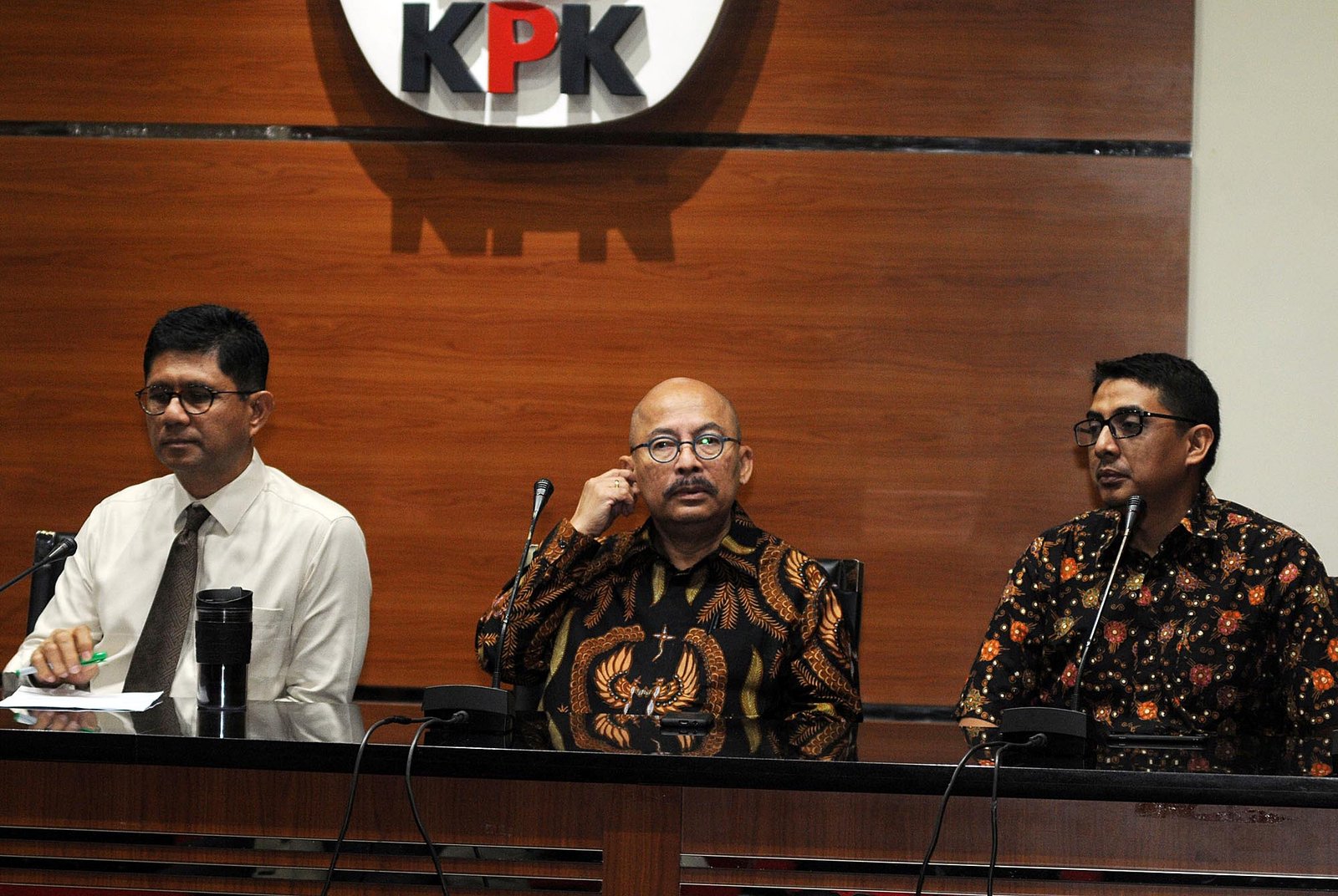 Wakil Ketua Komisi Pemberantasan Korupsi (KPK) Laode M Syarif (kiri), Anggota Pansel MK Mas Achmad Santosa (tengah) dan Anggota Pansel MK Zainal Arifin (kanan) memberikan keterangan kepada wartawan usai melakukan pertemuan di gedung KPK, Kuningan, Jakarta Selatan, Senin (9/7/18). Dalam pertemuan tersebut Pansel calon Hakim MK meminta masukan kreteria 9 nama calon hakim MK, Guru Besar Tetap Hukum Administrasi Negara FH UI sekaligus mantan Anggota Dewan Kehormatan Penyelenggara Pemilu Anna Erliyana, pengajar ilmu Hukum Tata Negara Universitas Gadjah Mada Yogyakarta Enny Nurbaningsih, Dosen Ilmu Hukum Tata Negara Universitas Surabaya Hesti Armiwulan, dosen Hukum Tata Negara/Hukum Administrasi Negara Universitas Pattimura Jantje Tjiptabudy, Wakil Ketua LPSK Lies Sulistiani, Profesor Hukum Tatanegara Universitas Islam Indonesia Ni’matul Huda, guru besar Perbandingan Hukum pada Prodi Ilmu Hukum, Fakultas Syariah dan Hukum, Universitas Islam Negeri Sunan Kalijaga Yogyakarta Ratno Lukito, Dosen Ilmu Hukum Tata Negara Universitas Padjajaran Susi Dwi Harijanti, dan Mantan Anggota Komisi Yudisial 2010-2015 Taufiqurrohman Syahuri.(Bisnis Jakarta/ADE)