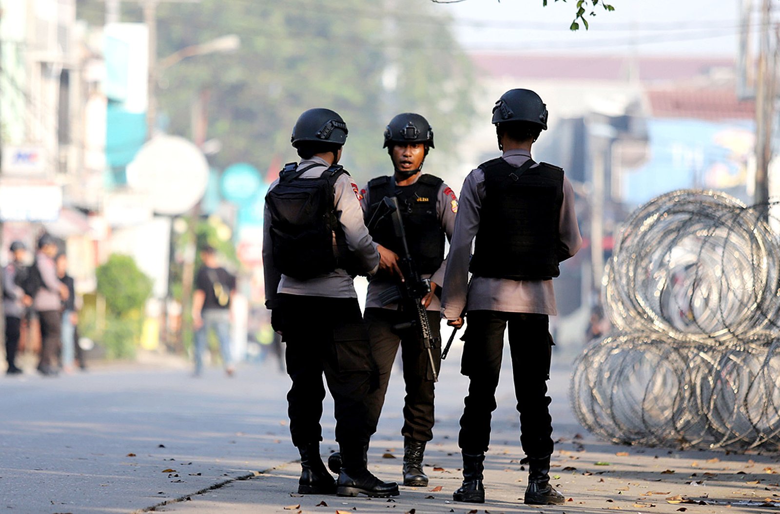 Petugas kepolisian meningkatkan pengamanan selepas peledakan bom rakitan milik teroris saat dilakukan penyergapan pascakerusuhan di rutan cabang salemba Mako Brimob Kelapa Dua, Depok, Jawa Barat, Kamis (10/5/18). Dalam penyergapan tersebut 155 tahanan teroris menyerah. Selanjutnya para tahanan teroris itu dibawa ke Lapas Nusakambangan.(Bisnis Jakarta/ADE)
