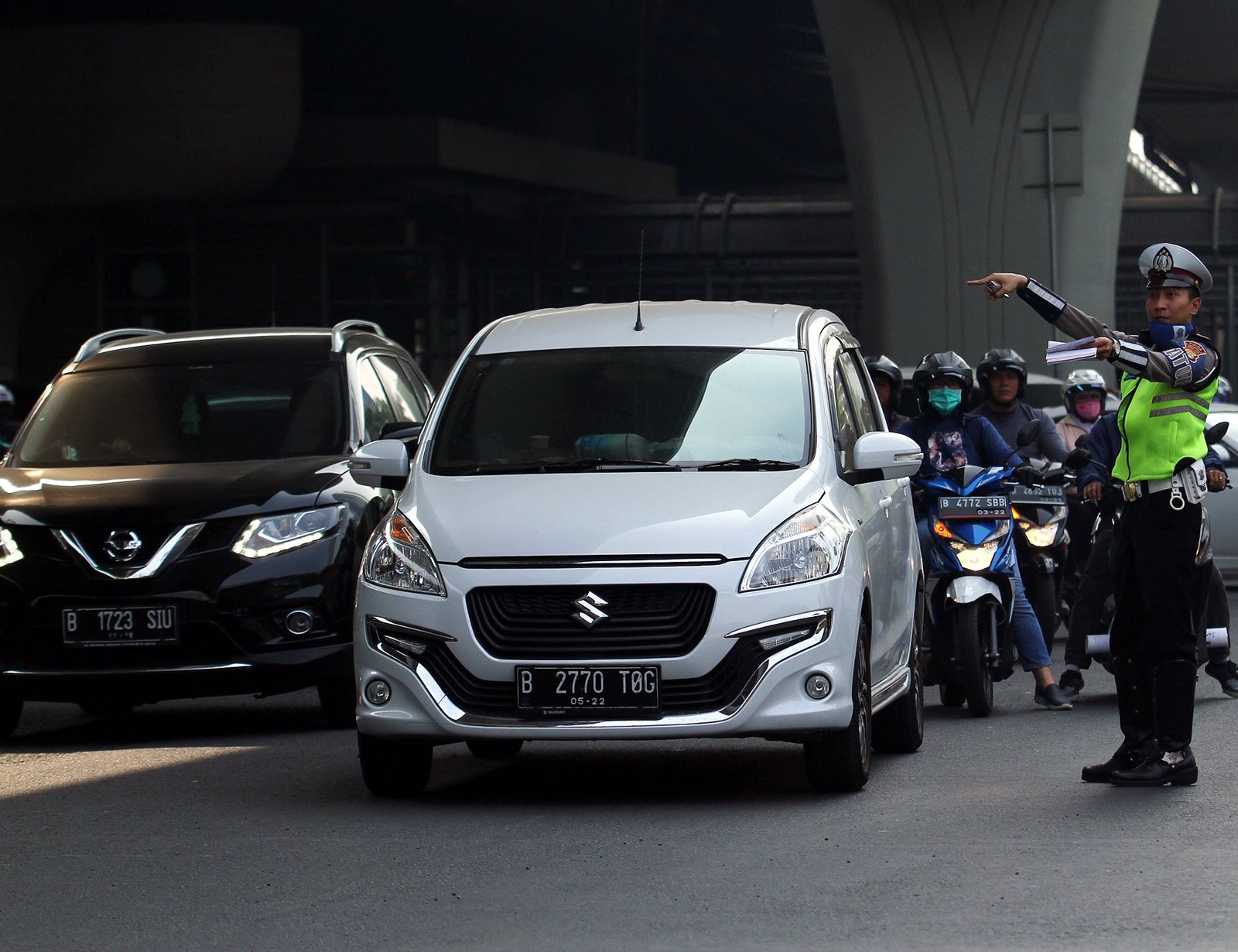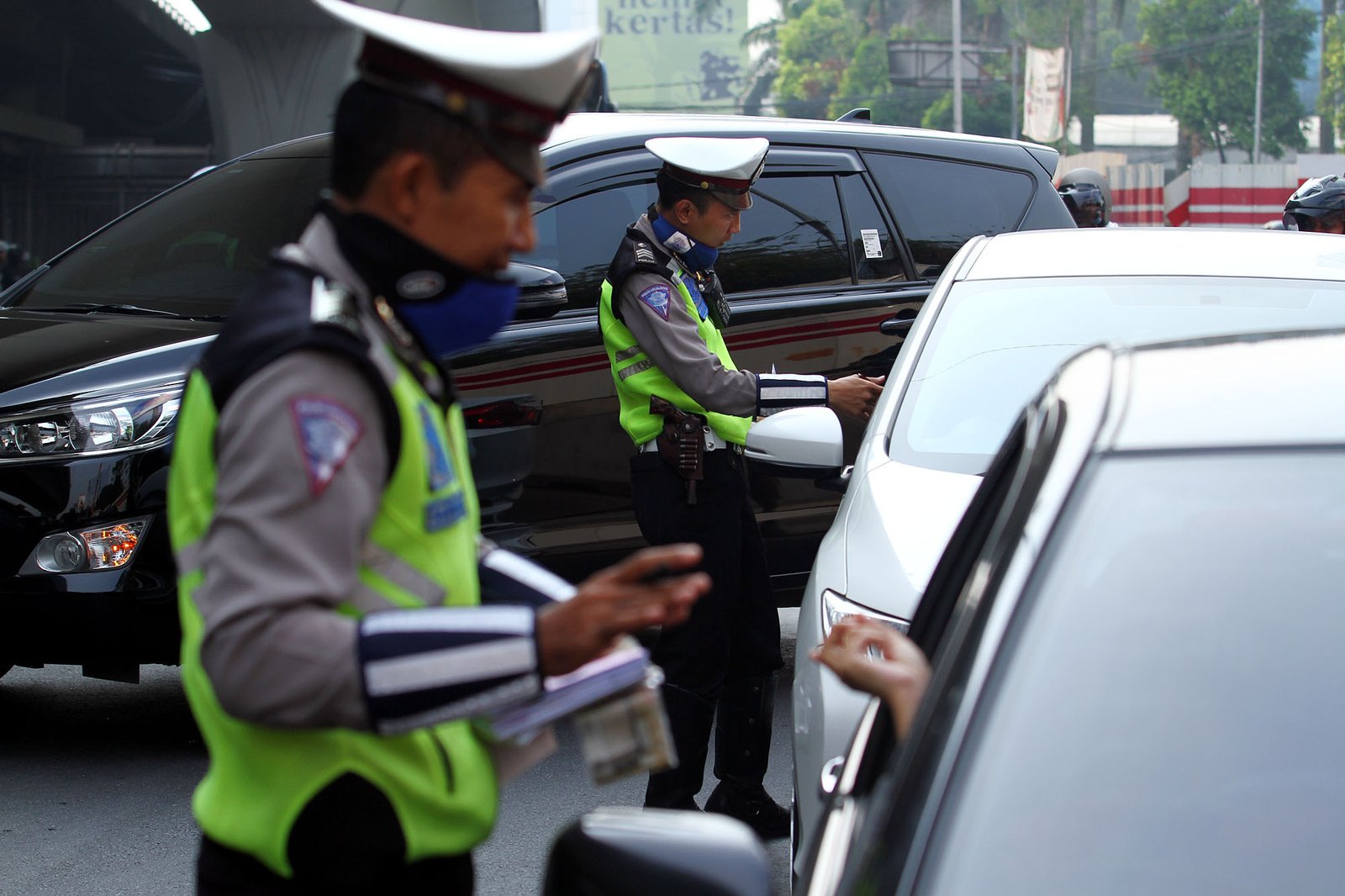 Polisi memberhentikan mobil berplat genap yang melintas pada tanggal ganjil di kawasan Pancoran, Jalan MT Haryono, Jakarta Selatan, Rabu (1/8/18). Aturan sistem perluasan lalu lintas ganjil-genap di sejumlah ruas jalan protokol Jakarta jelang penyelenggaraan Asian Games 2018 diberlakukan penilangan per tanggal 1 Agustus, dengan sanksi tilang sebesar Rp 500 ribu bagi pengendara yang melanggar sesuai dengan pasal 283jo pasal 106 ayat 1 UU No 22 2009 tentang UU Lalu Lintas Angkutan Jalan.(Bisnis Jakarta/ADE)