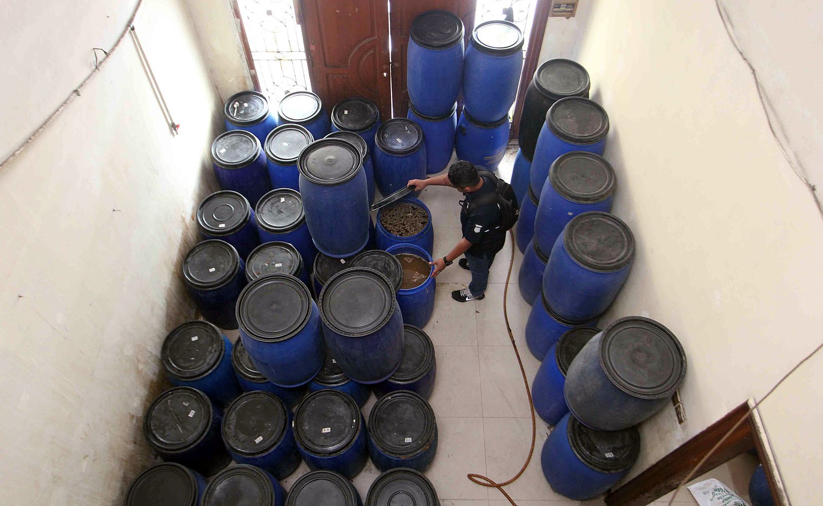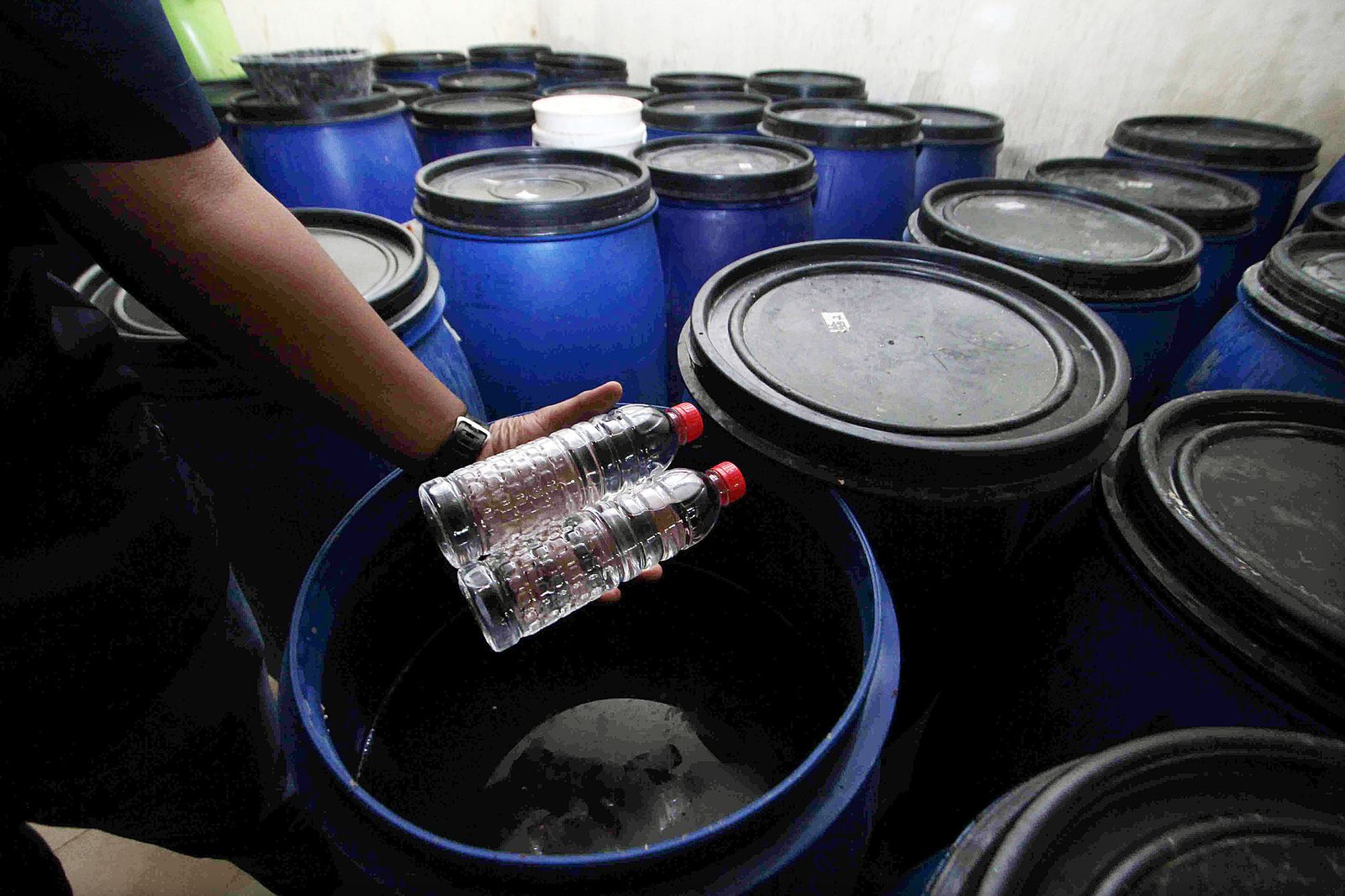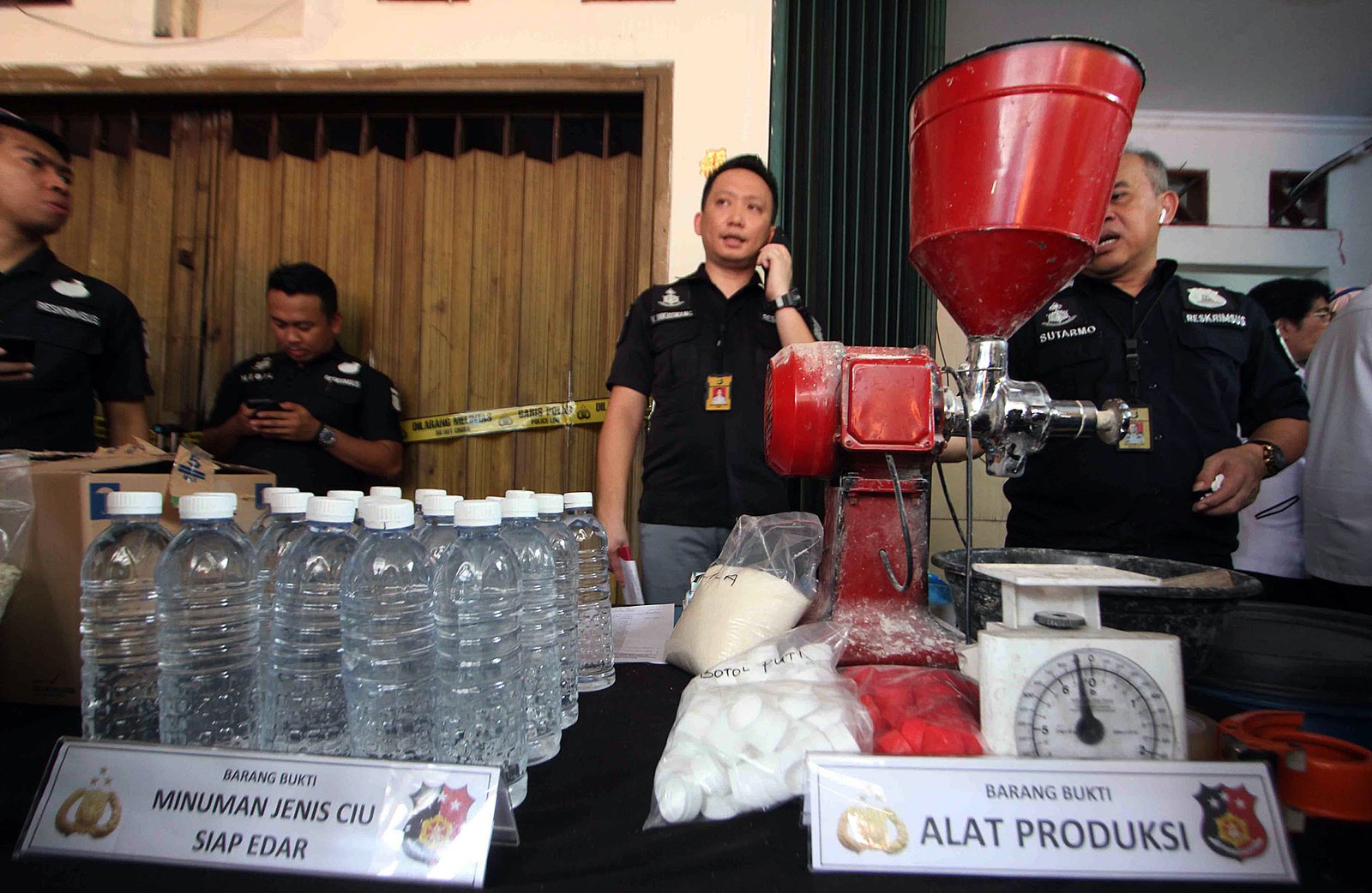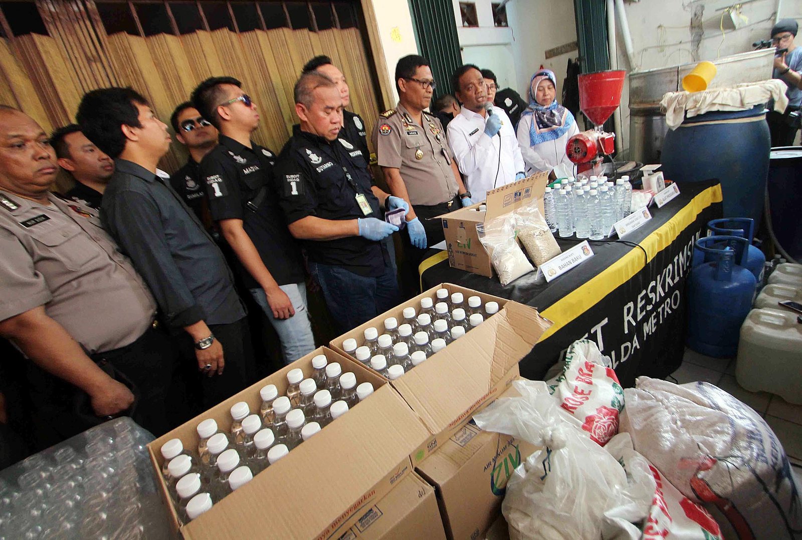 Petugas Ditreskrimsus Polda Metro Jaya menunjukan barang bukti berupa hasil olahan pangan sejenis minuman beralkohol (ciu) saat rilis pengungkapan kasus tersebut di kawasan Pekojan, Jakarta Barat, Kamis (3/5/18) kemarin. Polisi menangkap tersangka berinisial PRW karena mengolah minuman beralkohol tanpa izin edar dari BPOM, dengan barang bukti berupa bahan baku camputan fermentasi sebanyak 220 tong, minuman ciu siap edar dan alat produksi.(Bisnis Jakarta/ADE)
