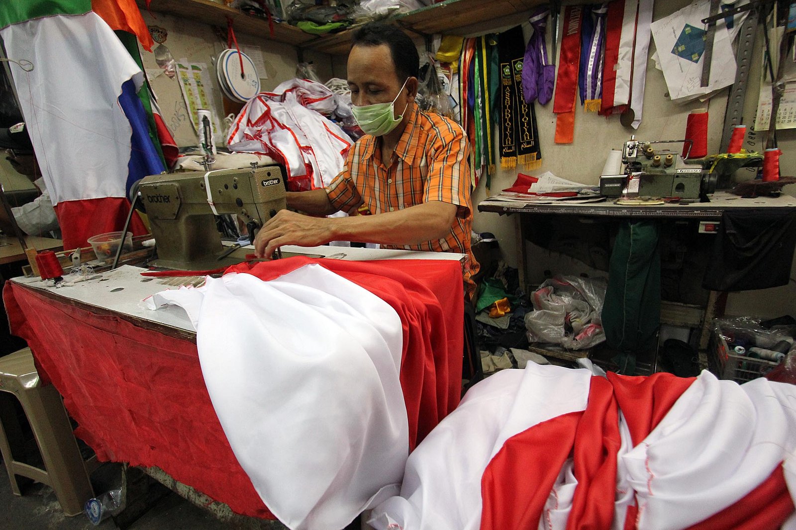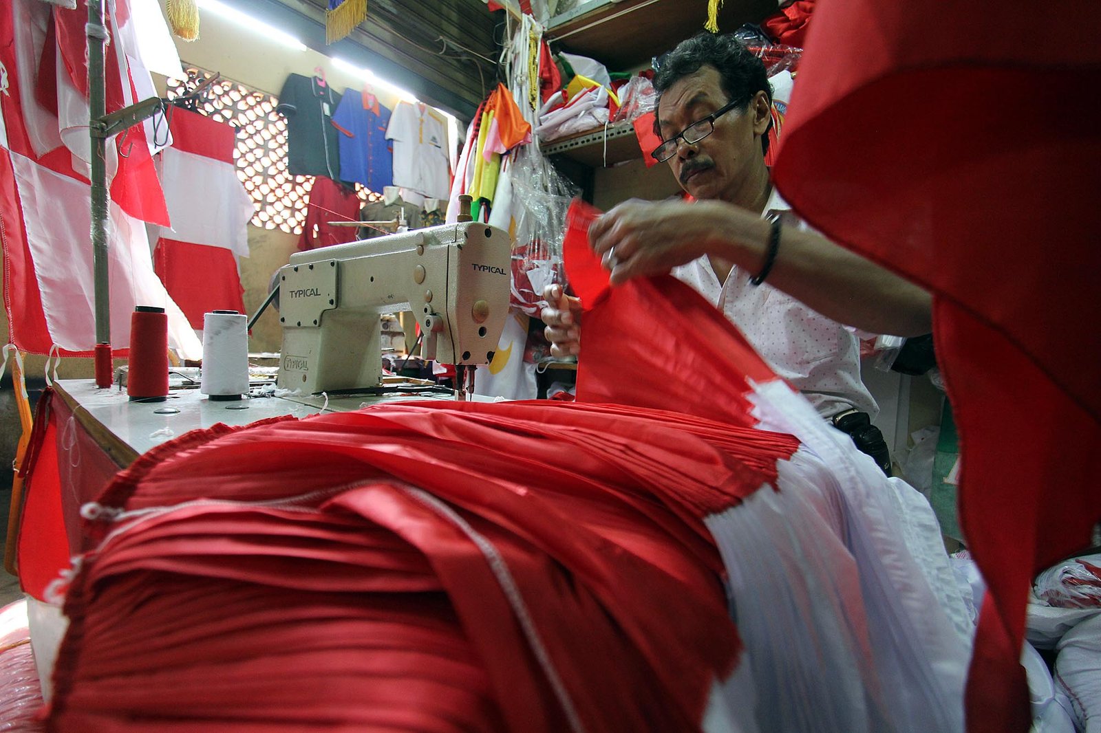 Penjahit bendera menyelesaikan pembuatan bendera merah putih di Pasar Senen, Jakarta Pusat, Kamis (3/8). Menjelang peringatan Hari Kemerdekaan ke-72 Republik Indonesia pemesanan bendera merah putih di Pasar Senen meningkat hingga 100 persen.(Bisnis Jakarta/ADE)