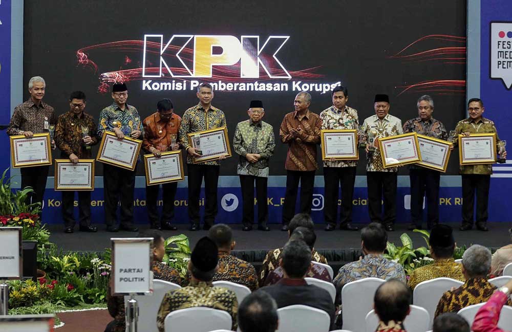 Wapres KH Ma’ruf Amin (tengah) didampingi Ketua KPK Agus Rahardjo (5kanan) berfoto bersama dengan sejumlah Kepala Daerah penerima penghargaan pada peringatan Hari Antikorupsi Sedunia di Gedung Komisi Pemberantasan Korupsi (KPK) di Kuningan, Jakarta Selatan, Senin (9/12/2019). KPK memberikan penganugerahan kepada sembilan pemerintahan Provinsi dan Daerah atas capaian implementasi pencegahan korupsi saat Hari Antikorupsi Sedunia 2019 yang bertemakan “Bersama Melawan Korupsi Mewujudkan Indonesia Maju”.(Bisnis Jakarta/ADE)