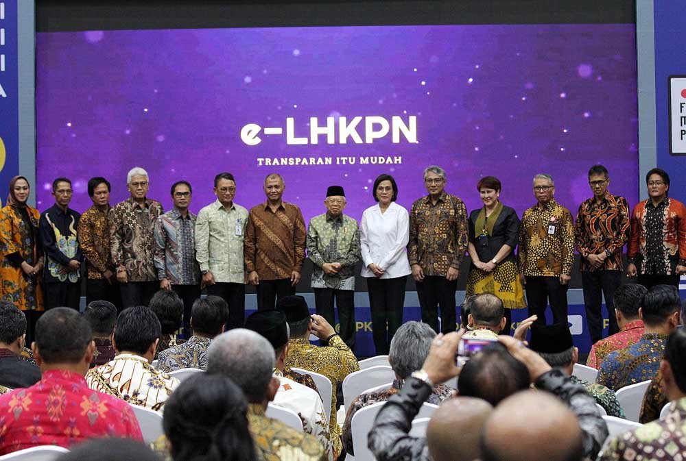 Wapres KH Ma’ruf Amin (tengah) didampingi Menteri Keuangan Sri Mulyanai (6kanan) dan Ketua KPK Agus Rahardjo (7kiri) berfoto bersama dengan sejumlah Kepala Daerah, Kementerian, Pimpinan BUMN serta Pimpinan BUMD usai menerima penghargaan penerapan e-LHKPN pada peringatan Hari Antikorupsi Sedunia di Gedung Komisi Pemberantasan Korupsi (KPK) di Kuningan, Jakarta Selatan, Senin (9/12/2019). KPK menggelar peringatan Hari Antikorupsi Sedunia 2019 dengan tema “Bersama Melawan Korupsi Mewujudkan Indonesia Maju”.(Bisnis Jakarta/ADE)
